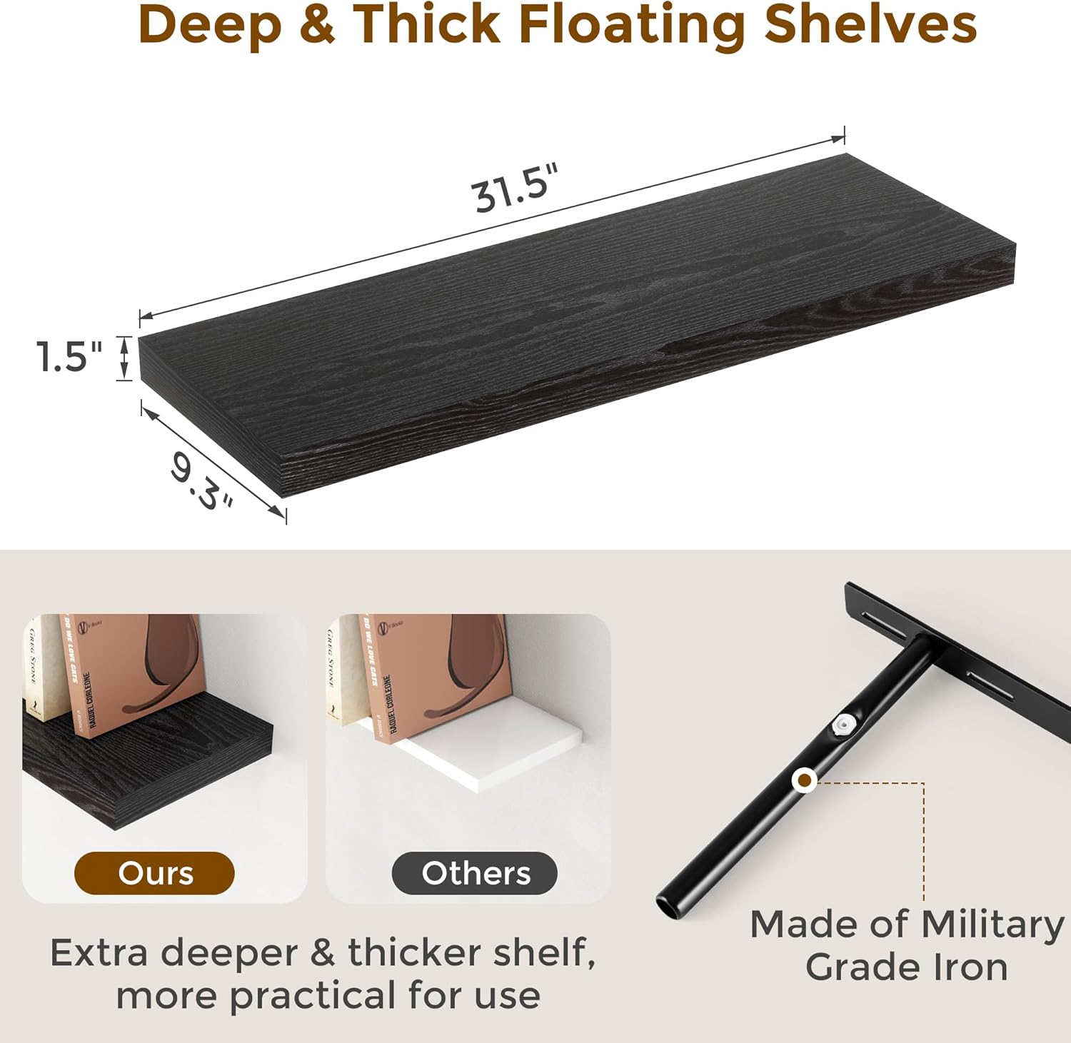 - 【9 INCH DEEP FLOATING SHELF】This extra deeper and thicker wall shelves are 9.3 inches in depth and 1.5 inches in thickness instead of the regular narrow floating shelves, you can put photos, pictures, DVD players, videos, books, toys, and some other knickknack on this beautiful display wooden shelf.
