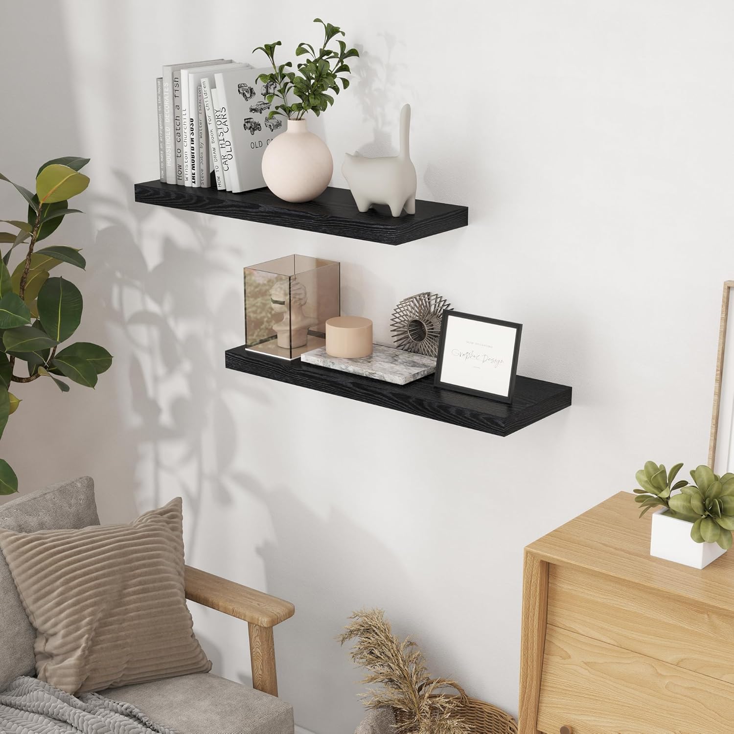 Fun Memories Black Floating Shelves 32 Inch Long, 9 Inch Deep Floating Bookshelf Wall Mounted, Farmhouse Wood Shelves White for Bathroom, Living Room, Bedroom, Home Decor Deep Shelf for Wall Set of 2
