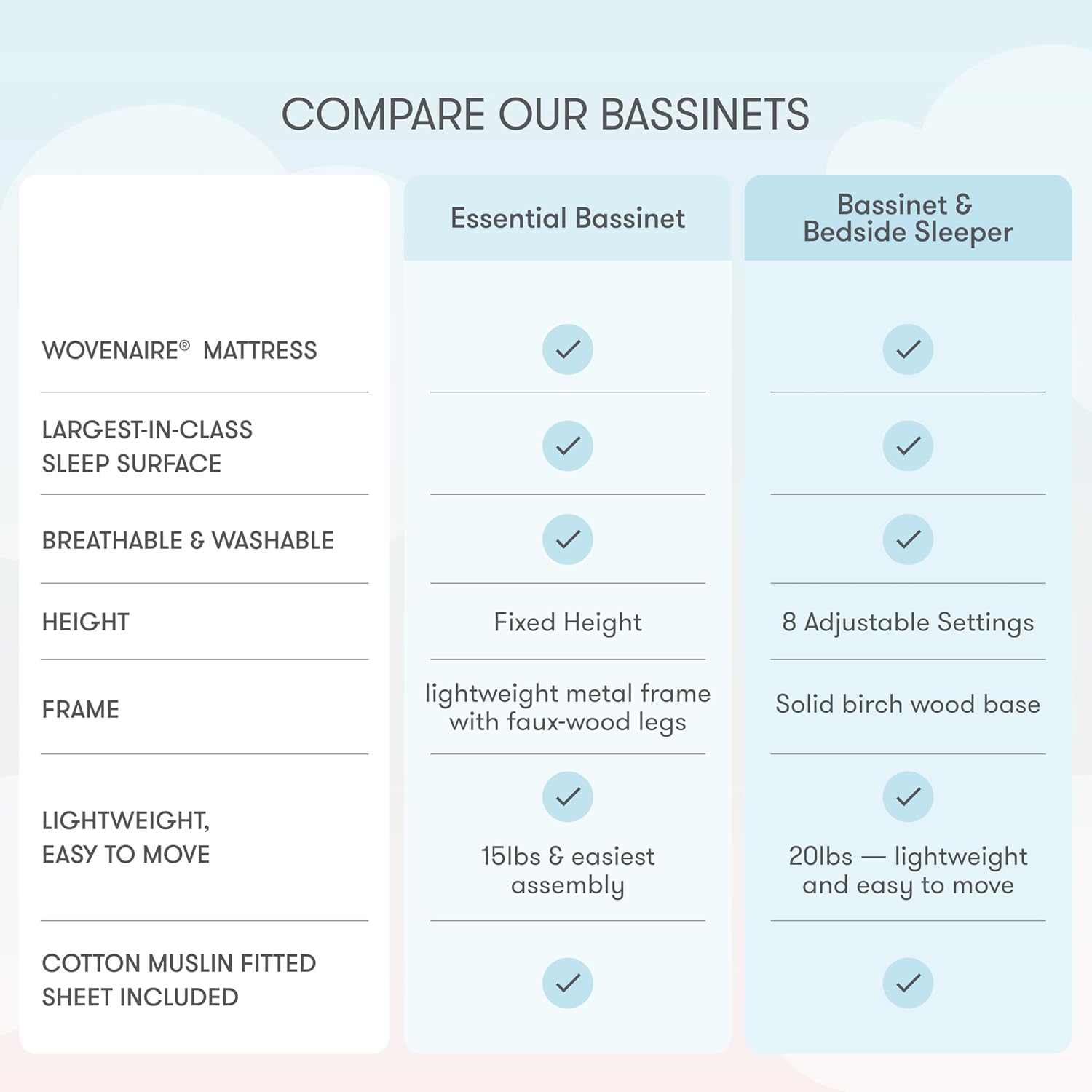 - BREATHE-THRU SAFETY: The ONLY bassinet with a Wovenaire breathe-thru mattress. Our patented technology ensures optimal breathability, reducing the risk of suffocation and overheating. And because your baby is sleeping safe and sound, you’ll sleep better too. Our essential bassinet measures 38.5" x 26.5" with a height of 28".