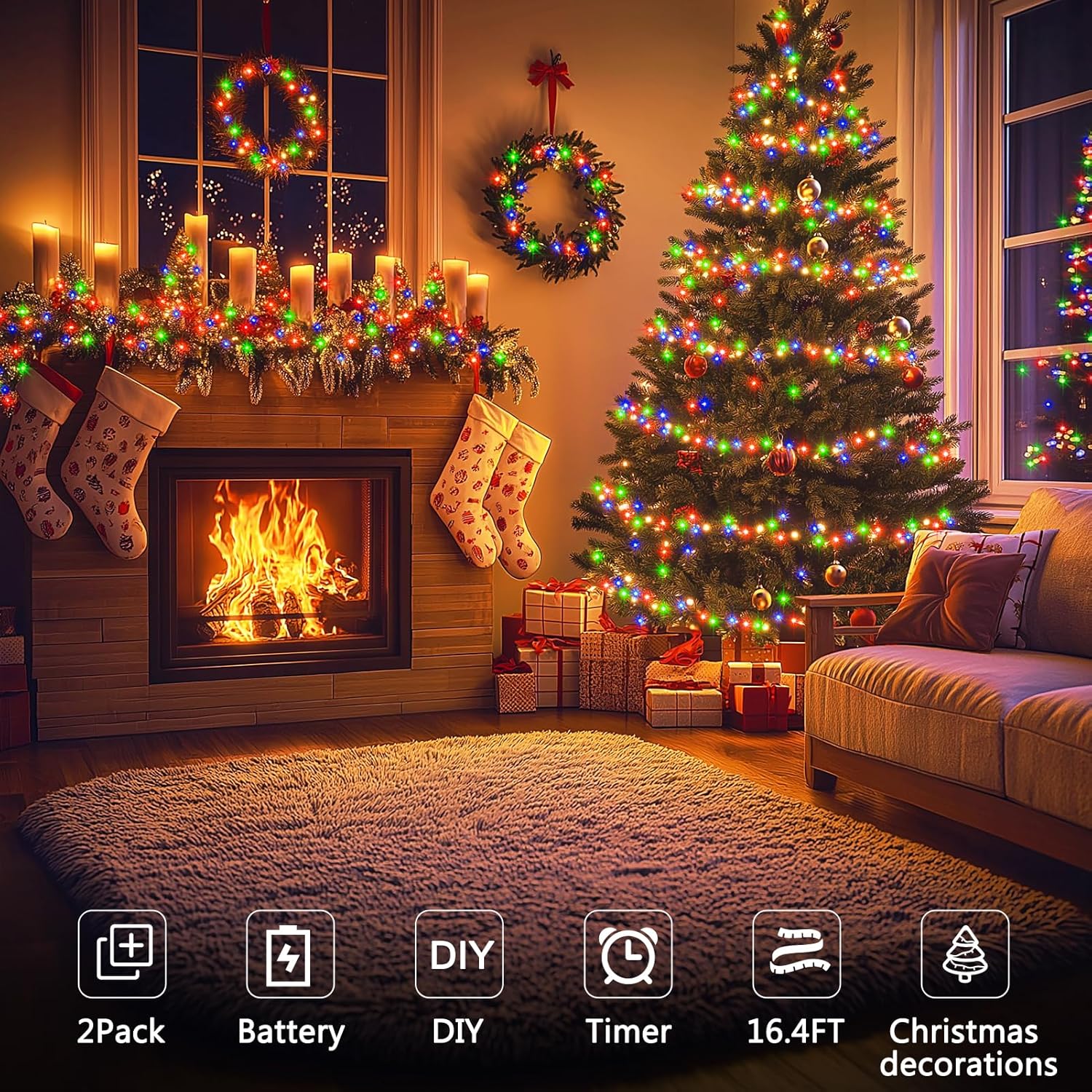 - 2-Pack Fairy Lights: The battery-powered fairy lights are 16.4 ft long (about 5 meters) and come with 50 LED beads. The dark green copper wire is perfect for Christmas decoration