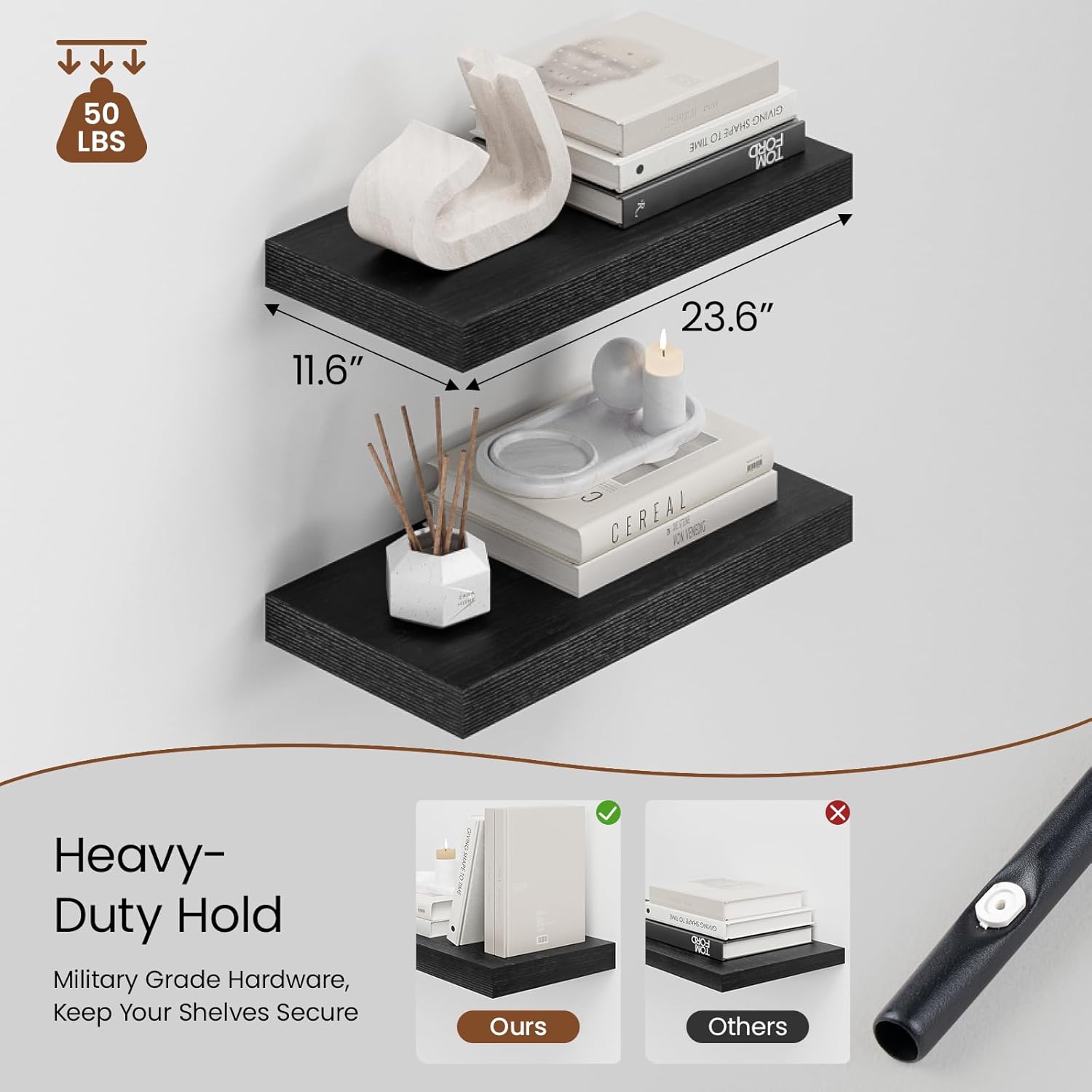 - Enhanced Durability: Heimlove wall shelves are built with military-grade iron hardware and engineered wood. With heavy-duty metal brackets, they provide long-lasting strength and stability for all your items. A high load capacity of up to 25 pounds. The sleek, invisible design adds a touch of elegance to any space.