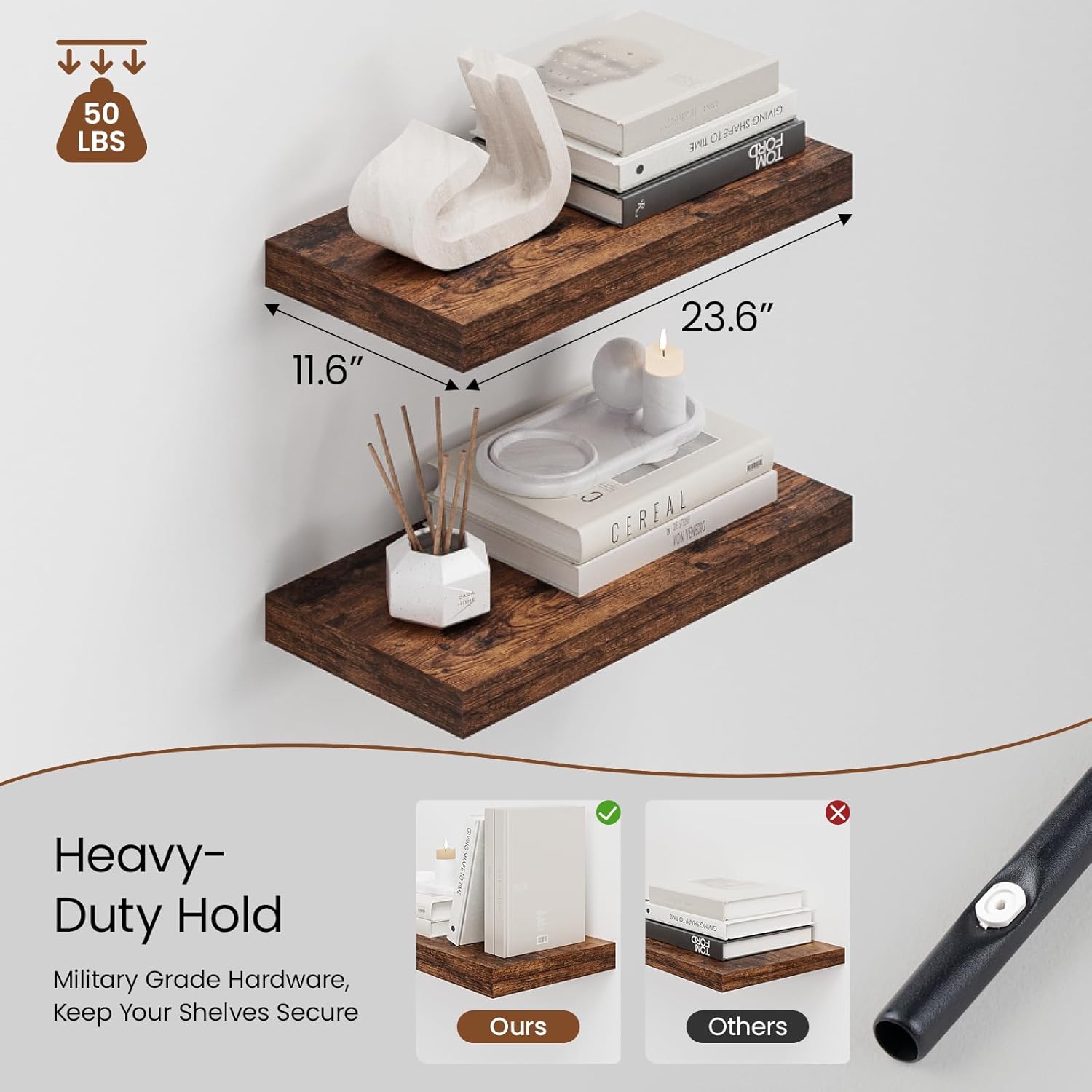 - Enhanced Durability: Heimlove wall shelves are built with military-grade iron hardware and engineered wood. With heavy-duty metal brackets, they provide long-lasting strength and stability for all your items. A high load capacity of up to 25 pounds. The sleek, invisible design adds a touch of elegance to any space.