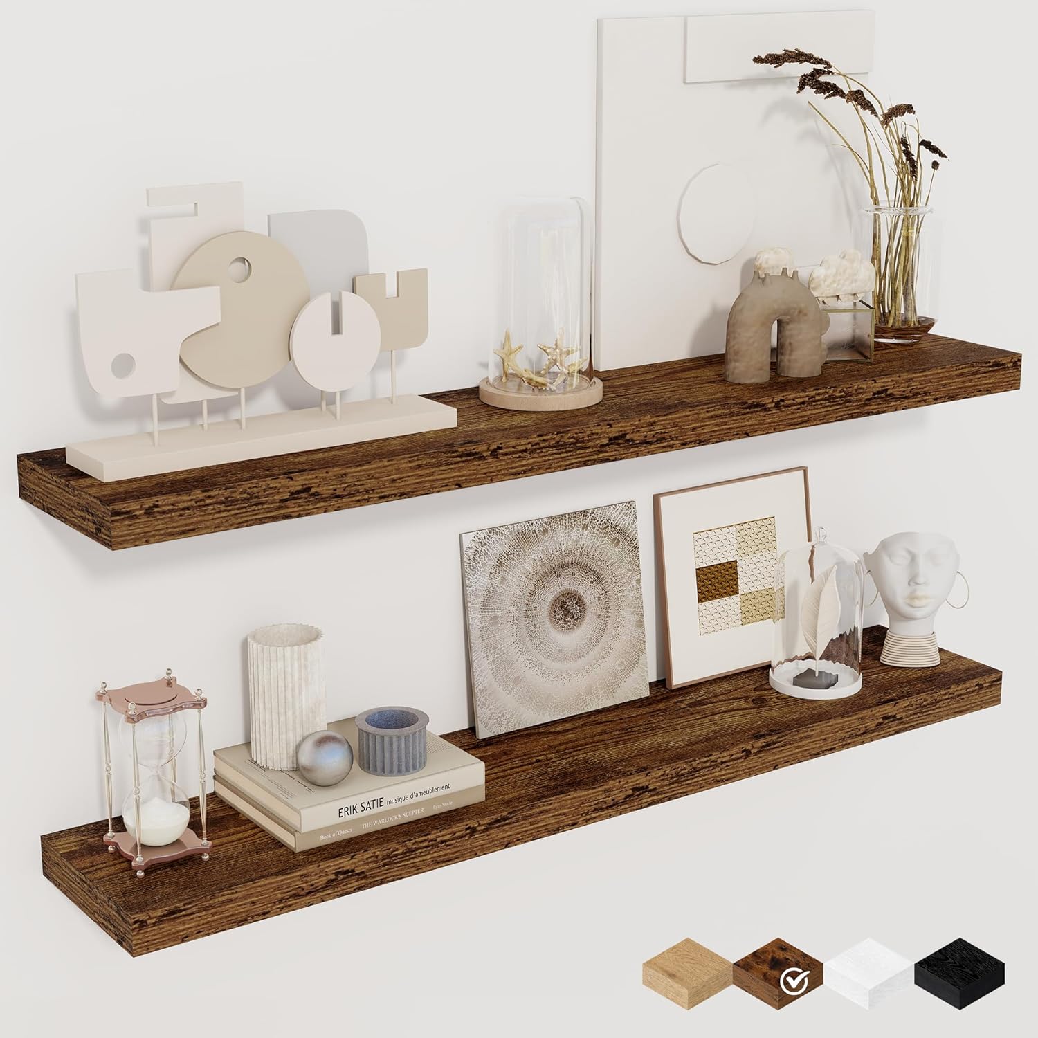 - STYLE & VERSATILITY: Elevate your home with our set of 2 elegant wall shelves, designed for versatile display options. Arrange them side by side for a clean, unified look, or stagger them for a bold, dynamic effect. Adding a touch of sophistication while providing practical storage
