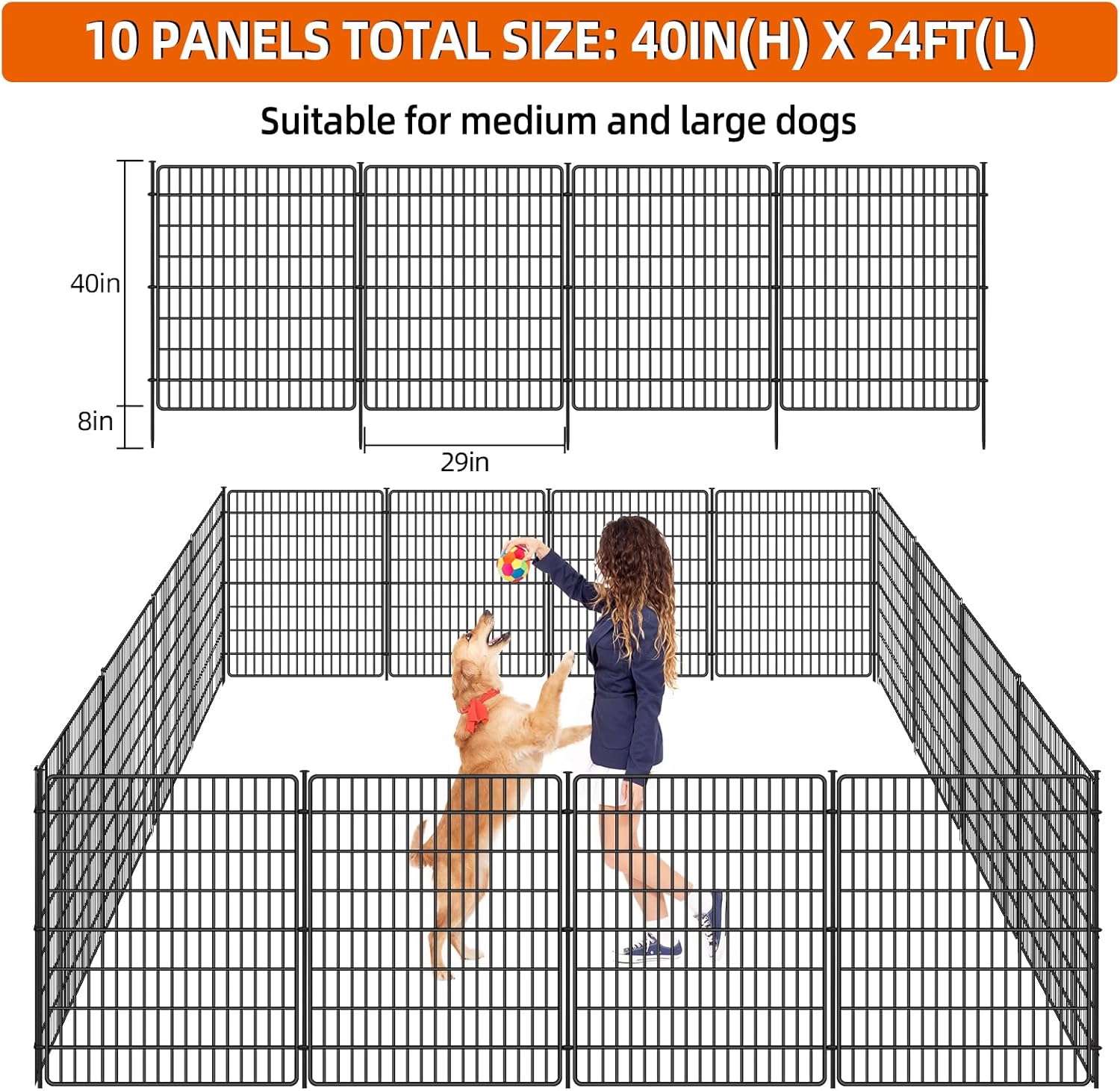- LARGE SIZE FENCES PANELS - 1 panel fence size: 40in H x 28.8in W, total size of 10 panels: 40in H x 24ft W. The fencing panels can be adjusted to create different shapes and sizes, or you can purchase additional fences to suit your needs