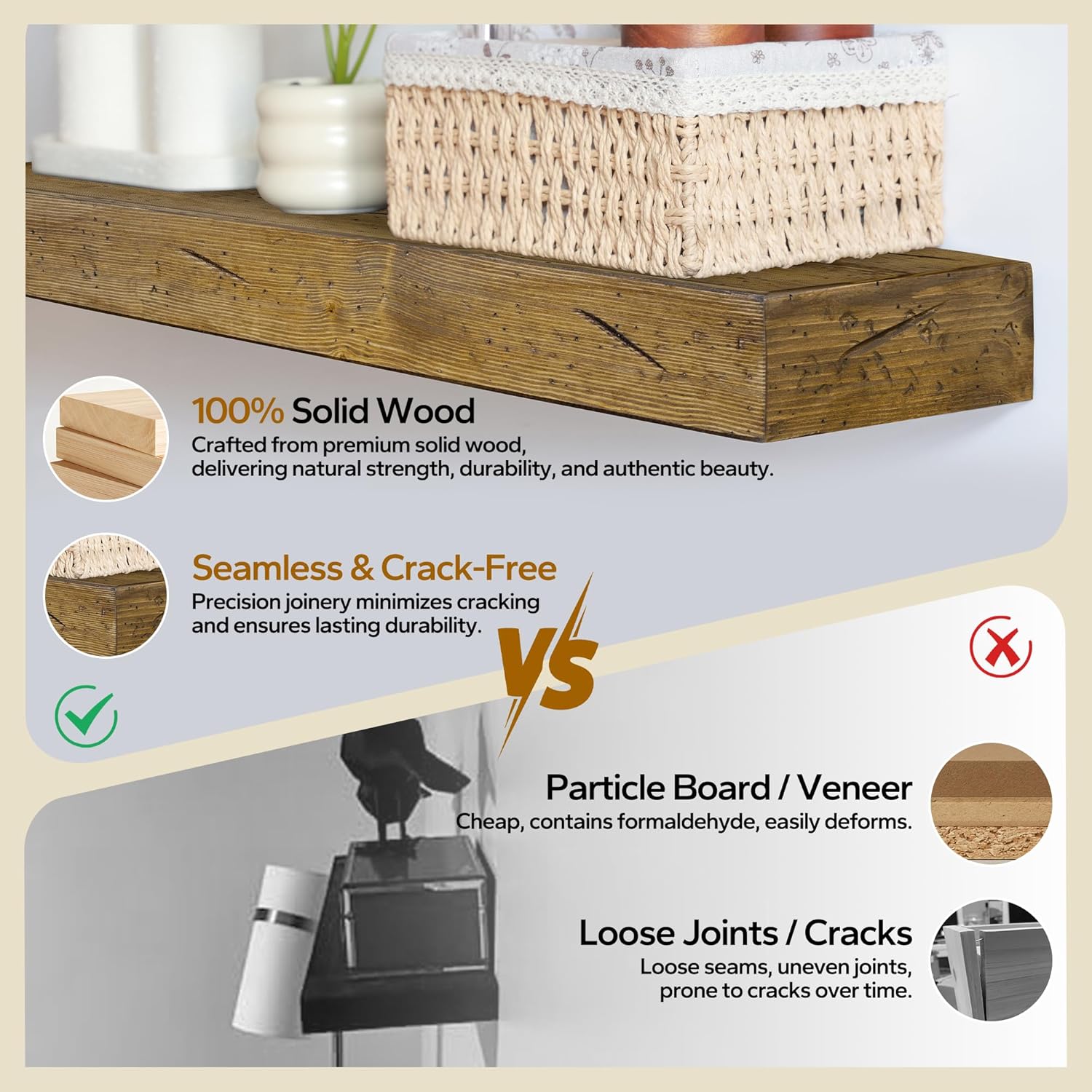 - Premium Handcrafted Solid Wood Shelves: Our floating shelves are made from 100% real solid pine wood, handcrafted to showcase the natural grain and unique knots of the wood. The rustic stain adds a timeless farmhouse charm, enhancing any home decor.