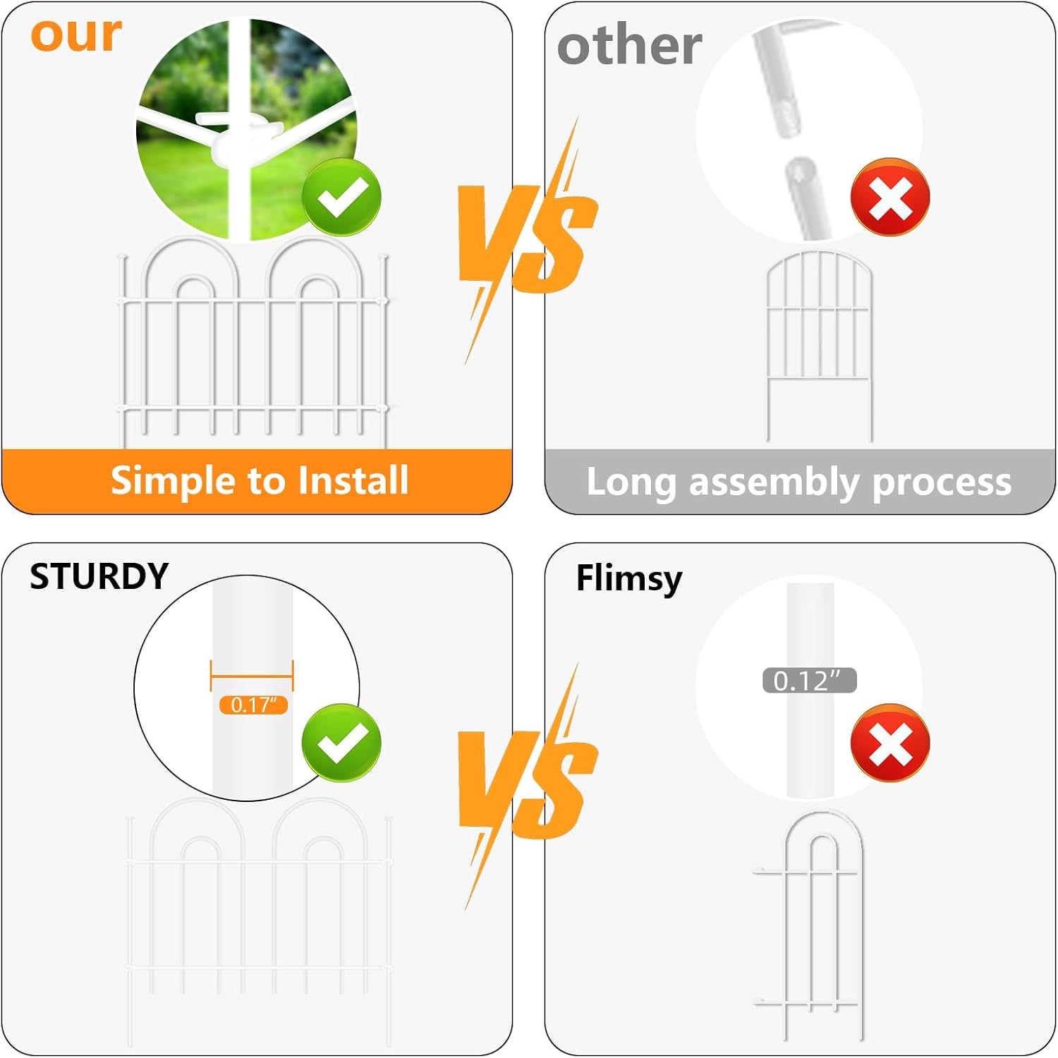 - EASY TO INSTALL - The metal rod stakes are used to connect and install the fences, you won't cause damage to the fences when installing the fences. It is easier to install the fences without additional accessories, compared with the snap method and zip cable method, which are difficult to install and easy to hurt hands, our rod stakes method is safer, simpler, easier to remove and reuse