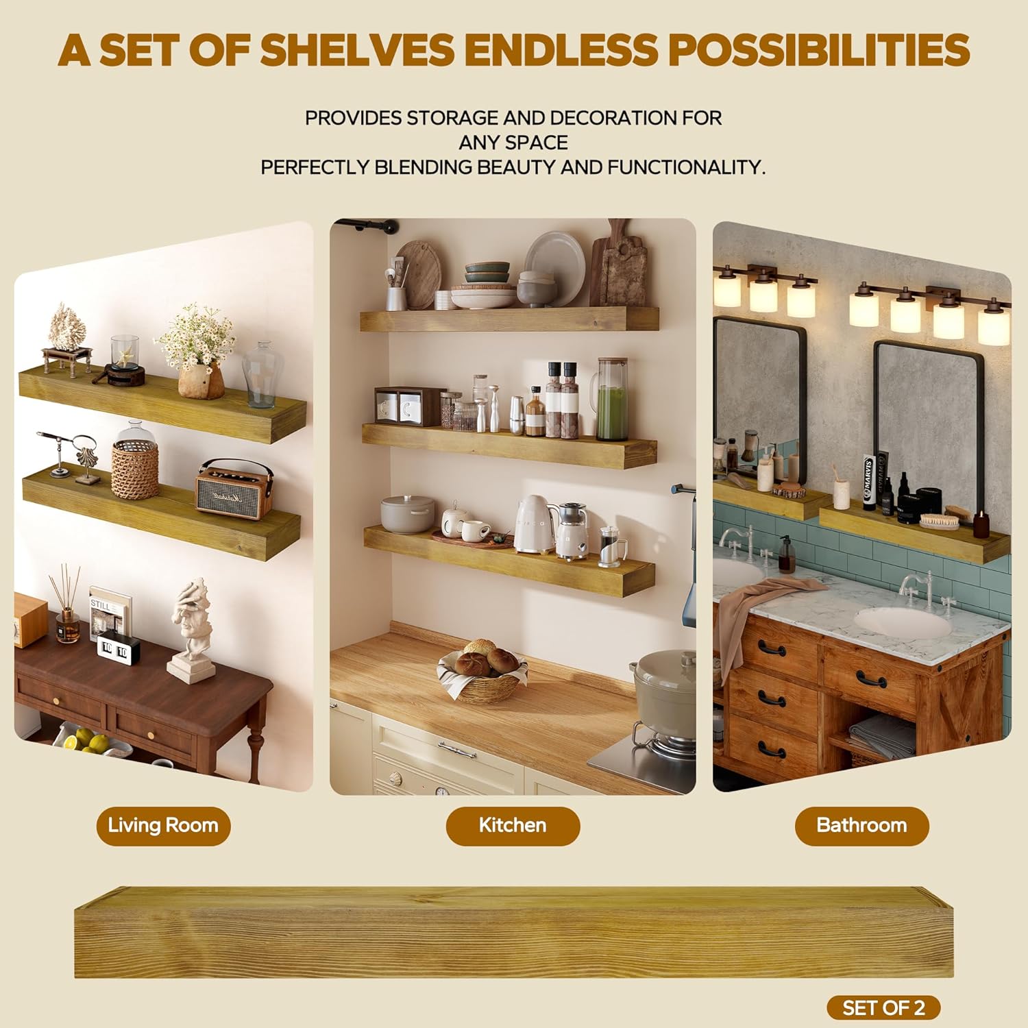 - Premium Handcrafted Solid Wood Shelves: Our floating shelves are made from 100% real solid pine wood, handcrafted to showcase the natural grain and unique knots of the wood. The rustic stain adds a timeless farmhouse charm, enhancing any home decor.
