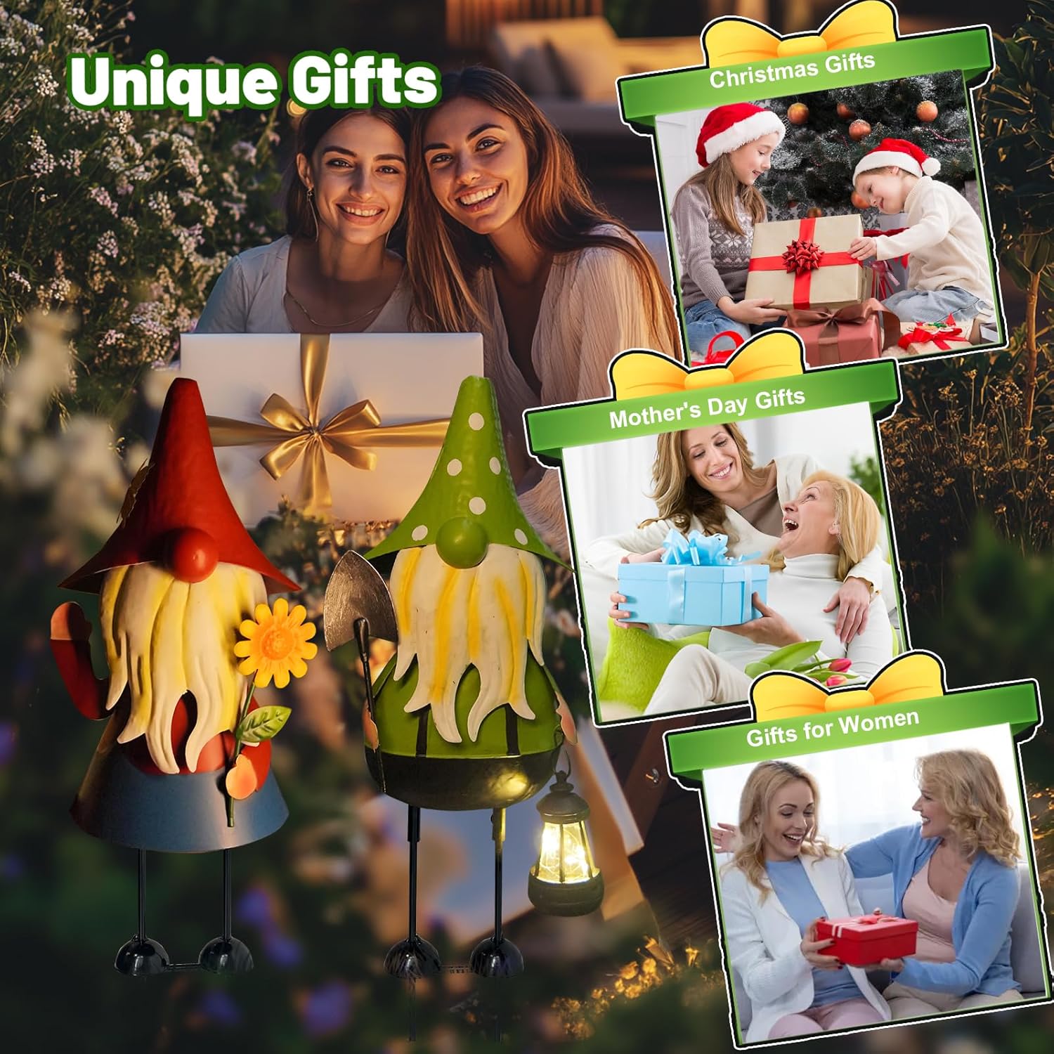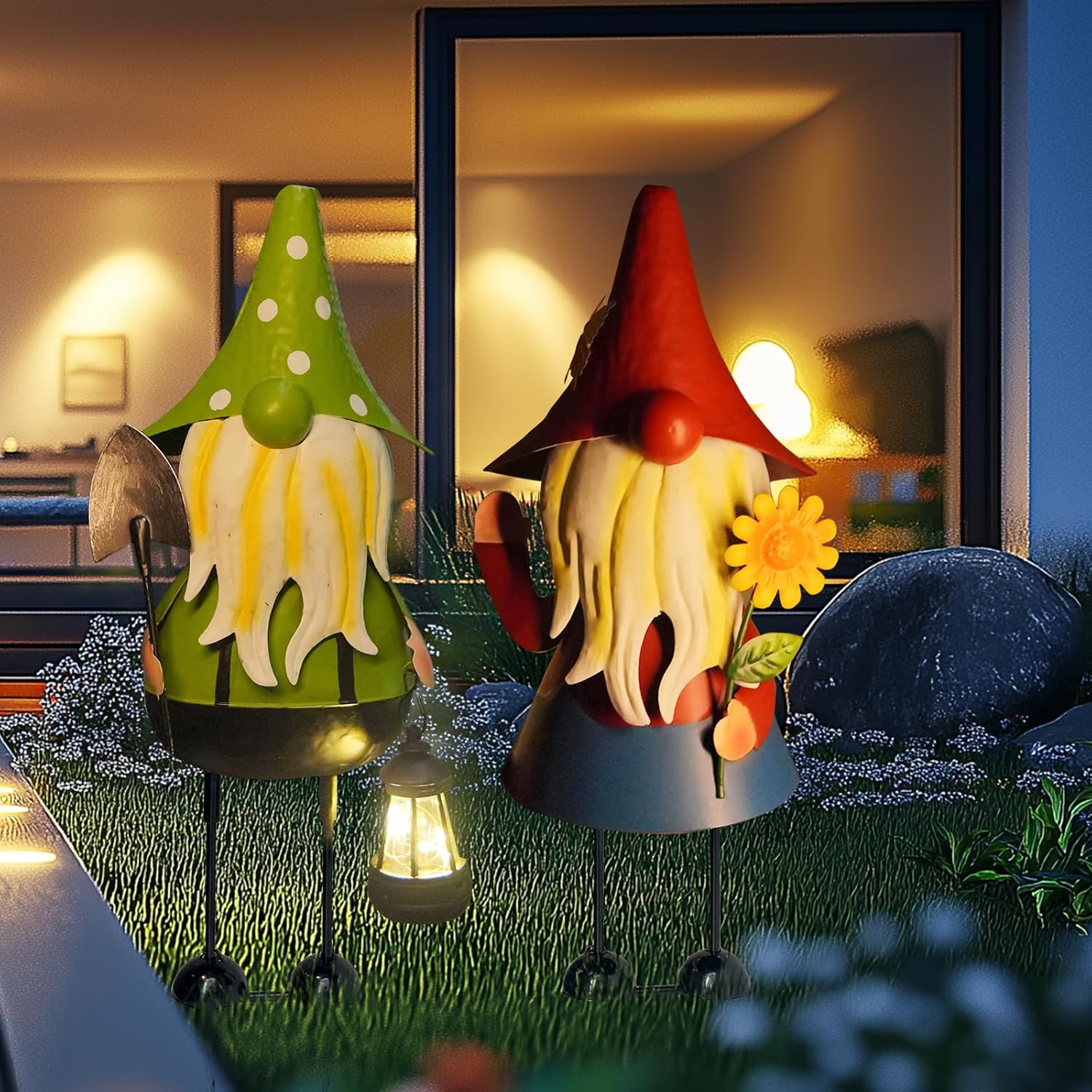 - 【Cute Solar Gnomes Yard Decor】Gnomes yard art wearing color hats, one holding a Solar Lantern and shovel, and another holding a flower. Add bright colors to your favorite outdoor space, create a whimsical vibe to your yard or garden