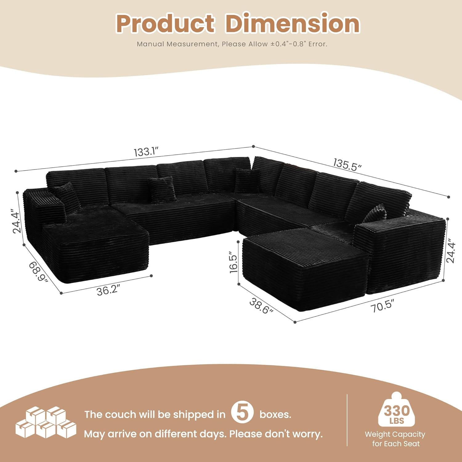 HOOOWOOO Cloud Sectional Couches for Living Room,Modular Sectional Sofa No Assembly,136X133 Inch Plush Corduroy Large G Shaped Floor Couch Set with Deep Seat Chaise Ottoman(Black)