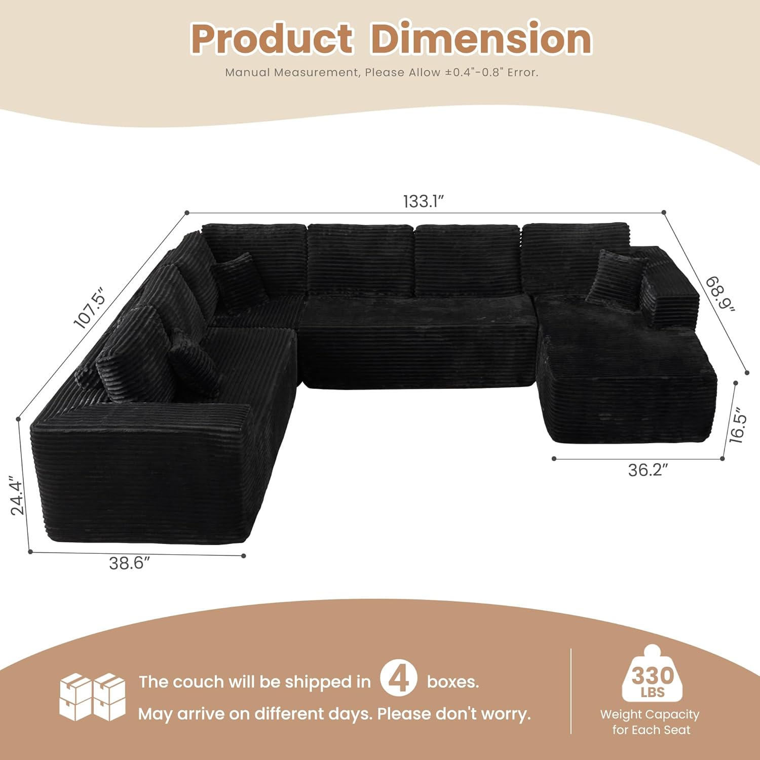 HOOOWOOO Cloud Sectional Couches for Living Room,Modular Sectional Sofa No Assembly,133X108 Inch Plush Corduroy Large U Shaped Floor Couch Set with Deep Seat Right Chaise(Black)