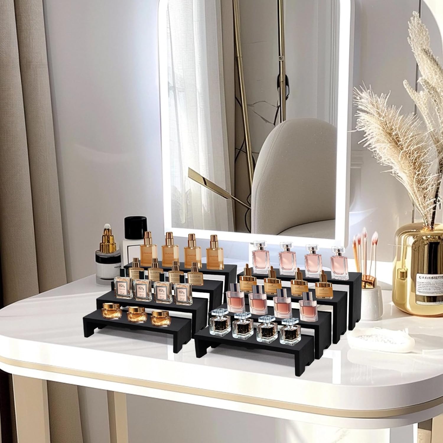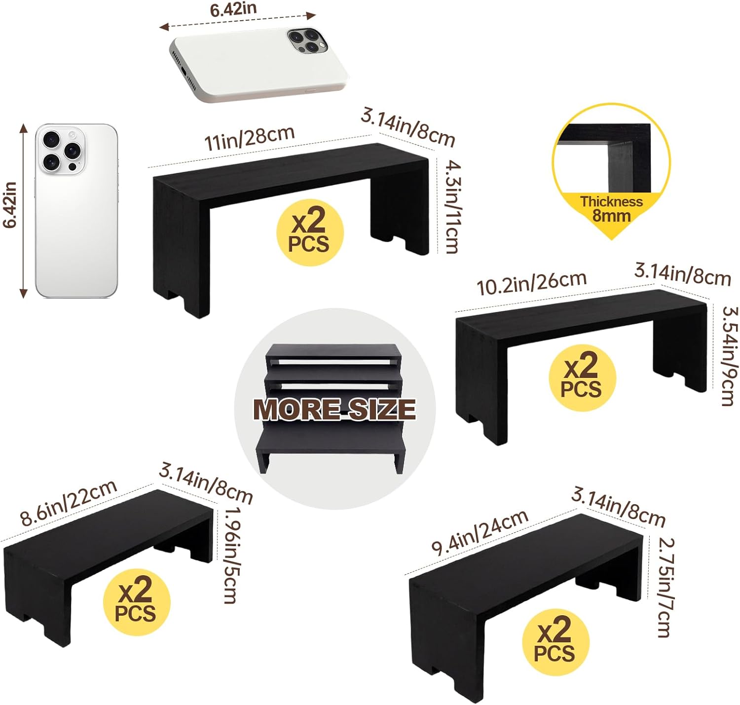 - 【Large Wooden Tierd Risers for Display】🎁: This 2 set 4 tier display shelf for cupcakes or vendors has stackable nesting design, so the wooden display risers easily access as desktop storage racks,also they has strong load-bearing capacity for more kinds perfumes, collectible figures,kitchen condiment bottles, bathroom toiletries because of varieties size of (L8.6''/22cm-9.4''/24cm-10.2''/26cm-11''/28cm)XW3.14'' /8cm