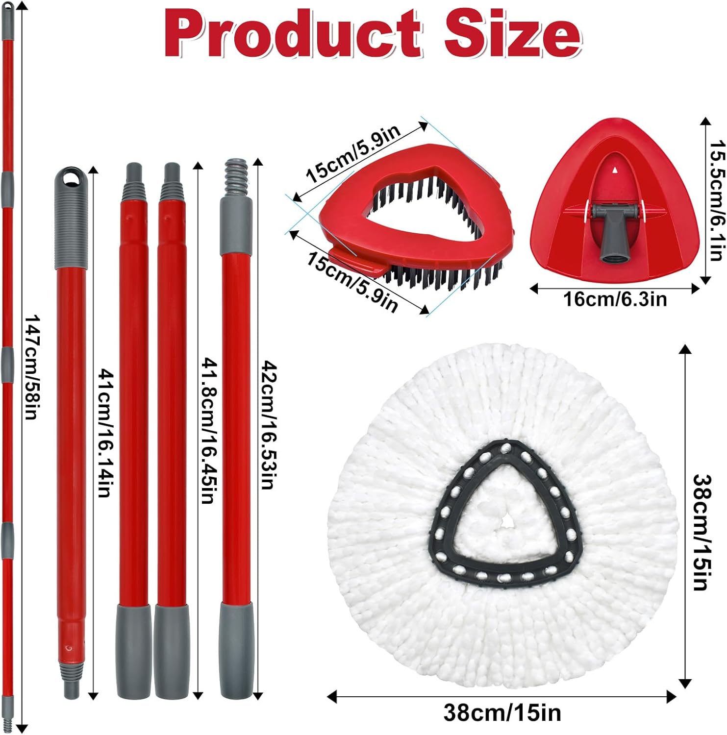 - 【Valuable Oceda Mop Sets】Includes 2 Rinseclean's microfiber mop head, 4-section iron mop handle that extends from 30-58", and 1 spin mop head base and 2 triangular brush.Spin mop head replacement units replace are easy to install and remove,the triangular chassis design harmless your furniture.