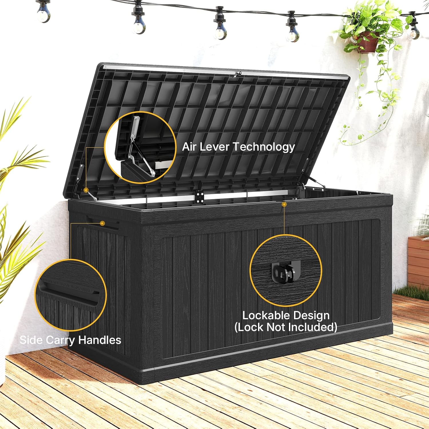 - 【Secure & User-Friendly】Featuring lockable latch points (lock not included) for item security, outdoor storage box incorporates a gas-strut lid mechanism for smooth, effortless opening and closing.