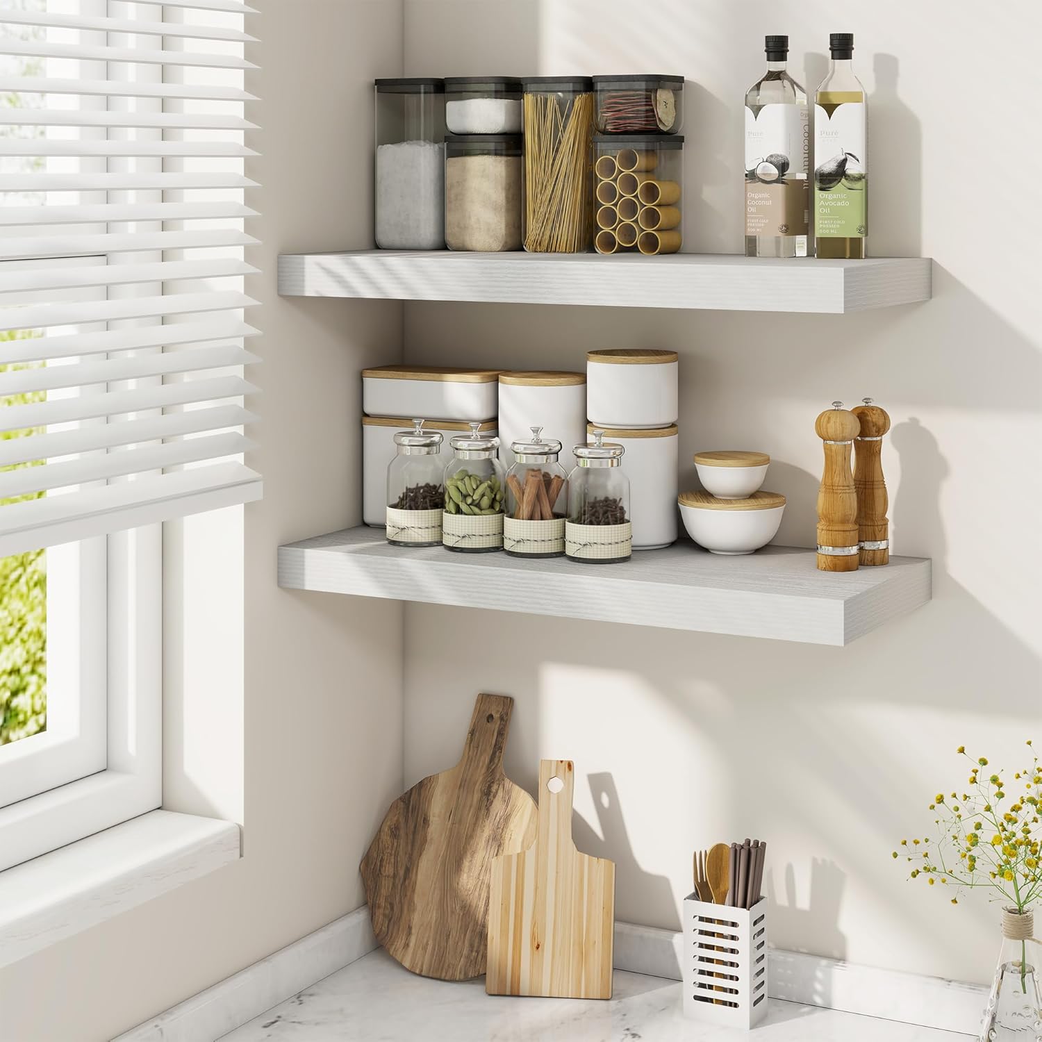Fun Memories 24 Inch Floating Shelves for Wall, 9 Inch Deep White Rustic Wood Wall Mounted Shelves for Bathroom, Kitchen, Living Room, Set of 2