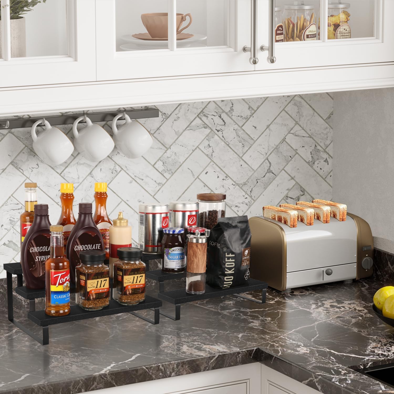 YINMIT Wooden Display Riser Stand, Tiered Perfume and Cologne Organizer Stand, 3 Tier Spice Rack Organizer, Rustic Display Shelf for Candles (3 Tier,2Pack,Black)