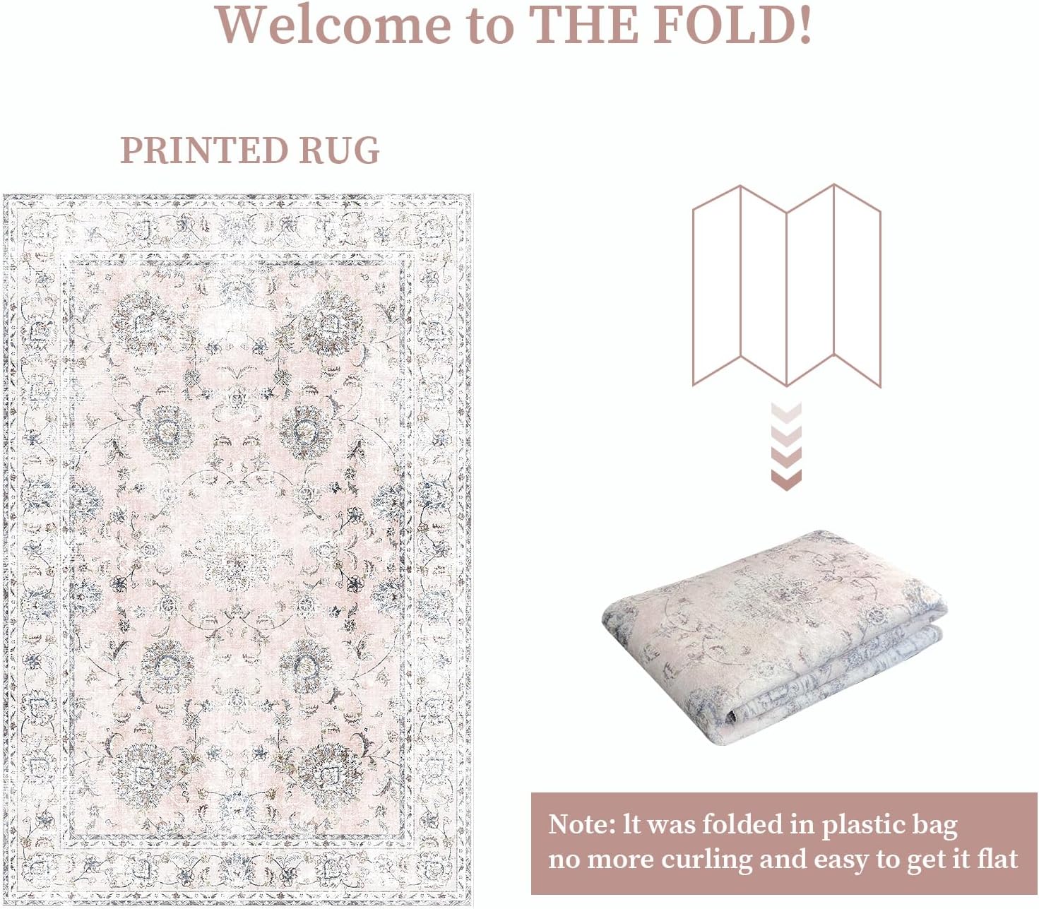 3'x5' Vintage Floral Rug - Persian Inspired Low-Pile Faux Wool Area Rug, Non-Slip Washable Small Rug for Bedroom, Nursery, Dorm, Soft Pink Boho Chic Decor