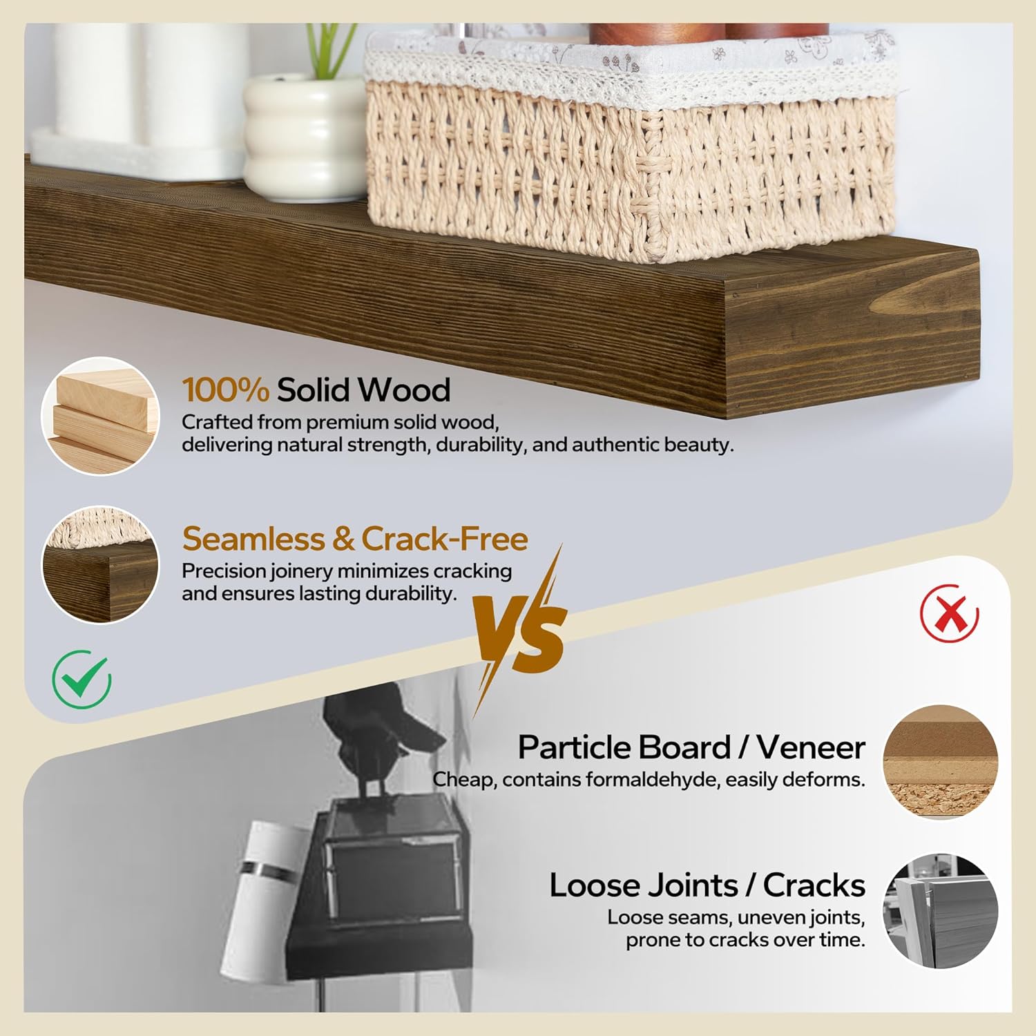 - Unique Wood Floating Shelves: Each wood floating shelf is uniquely handcrafted. Due to the natural variations in wood grain, knots, and texture, the color may slightly differ from the sample shown, but it is equally stunning.