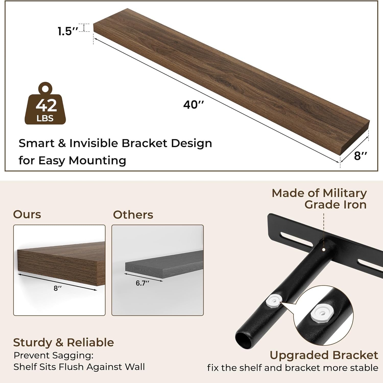 - 40 Inch Floating Shelves for Wall (Set of 2): Each wall shelves are 8 inches in depth and 1.5 inches in thickness. 2-piece set is more cost-effective and practical. Our wall shelf can be used in combination, staggered high or low on the wall, or mounted side-by-side to provide extra storage space for organizing small items and clutter in multiple areas such as kitchens, bathrooms, and bedrooms, creating a clean and smooth look. Multiple colors available