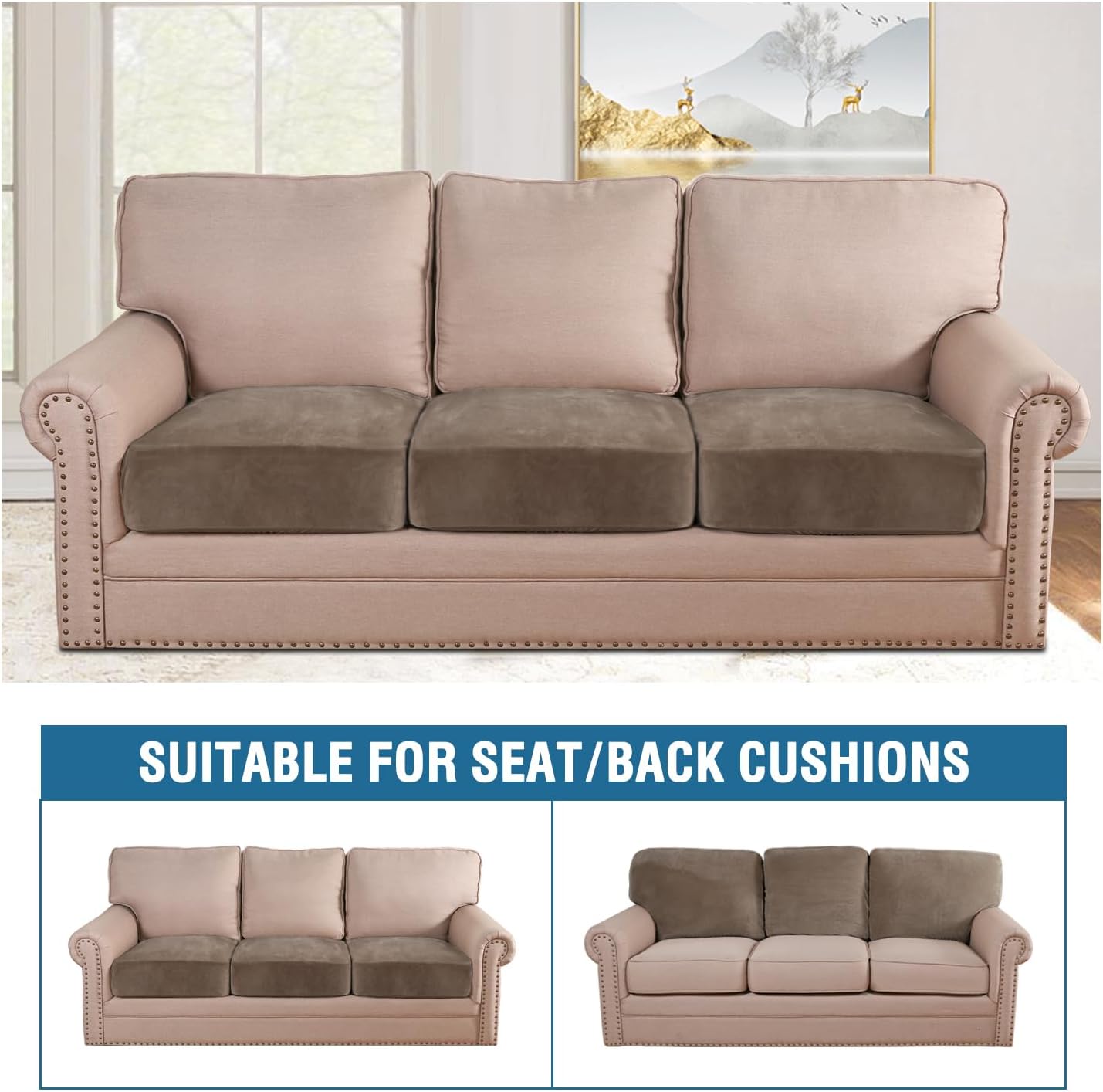 H.VERSAILTEX Velvet Stretch Couch Cushion Cover Plush Cushion Slipcover for Chair Loveseat Sofa Cushion Furniture Protector Seat Cushion Sofa Cover (3 Piece XL Sofa Cushion Covers, Mocha)