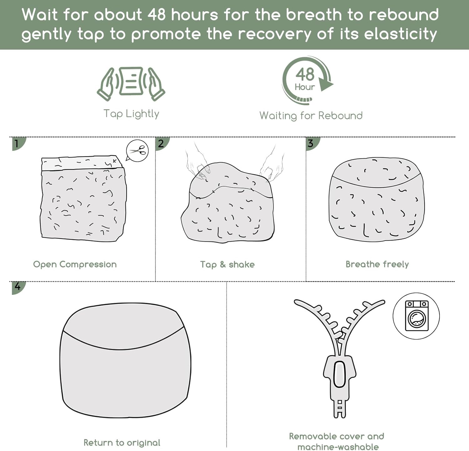 - For convenience and ease of use, this pouf ottoman comes pre-filled with memory foam chunk pouf filler, which can be easily inserted through the large round opening on the bottom with double zippers.