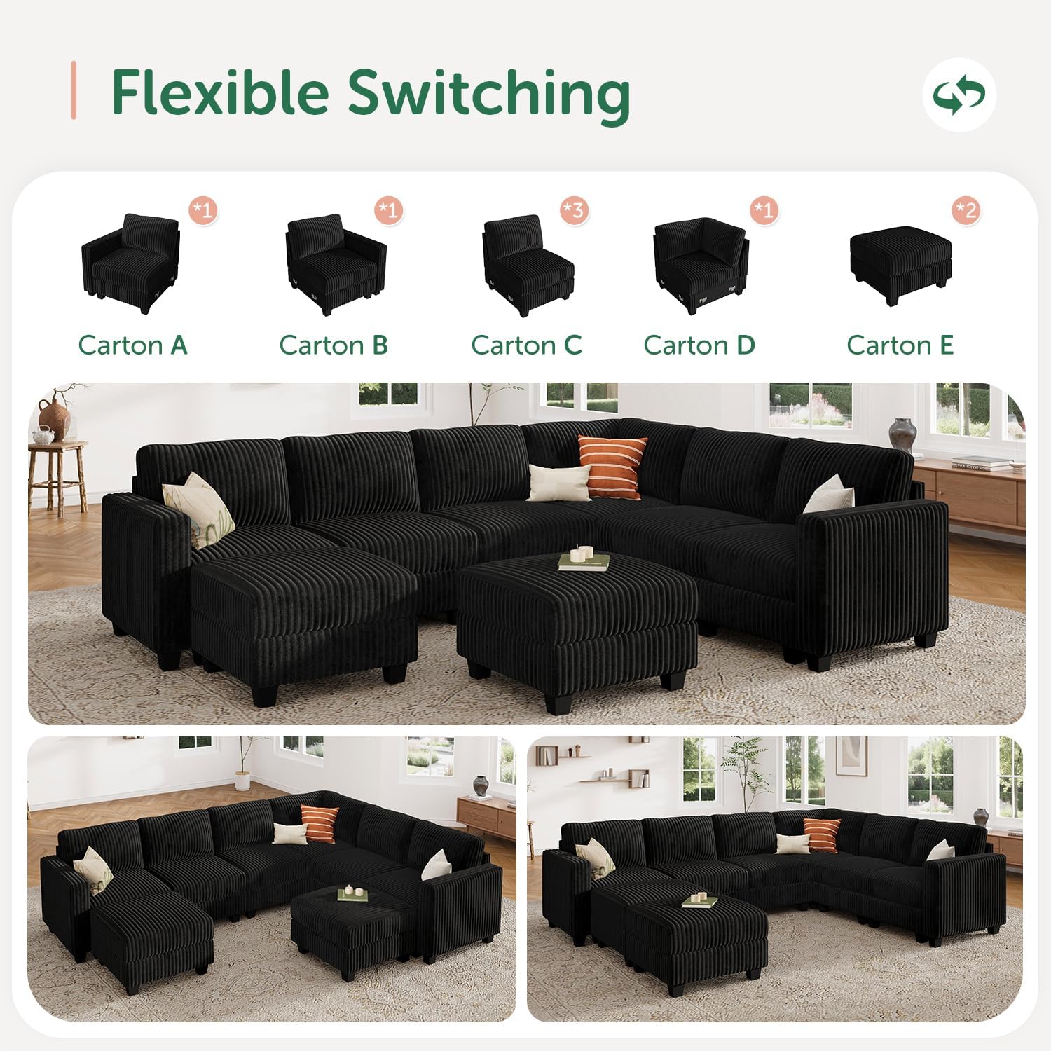 HONBAY Corduroy Sectional Couch with Storage U Shaped Sectional Sofa Modular Sectional Couches for Living Room, Black