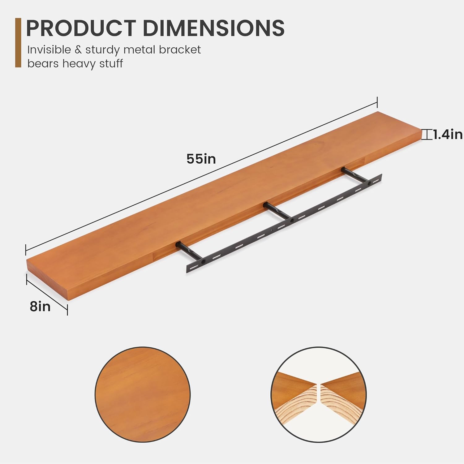 Fun Memories 55 Inches Floating Shelves - 8 Inch Deep Rustic Solid Pine Wood Wall Shelves for Storage - Farmhouse Wall Mounted for Living Room - Heavy-Duty Metal Bracket - 55" W x 8" D - Honey