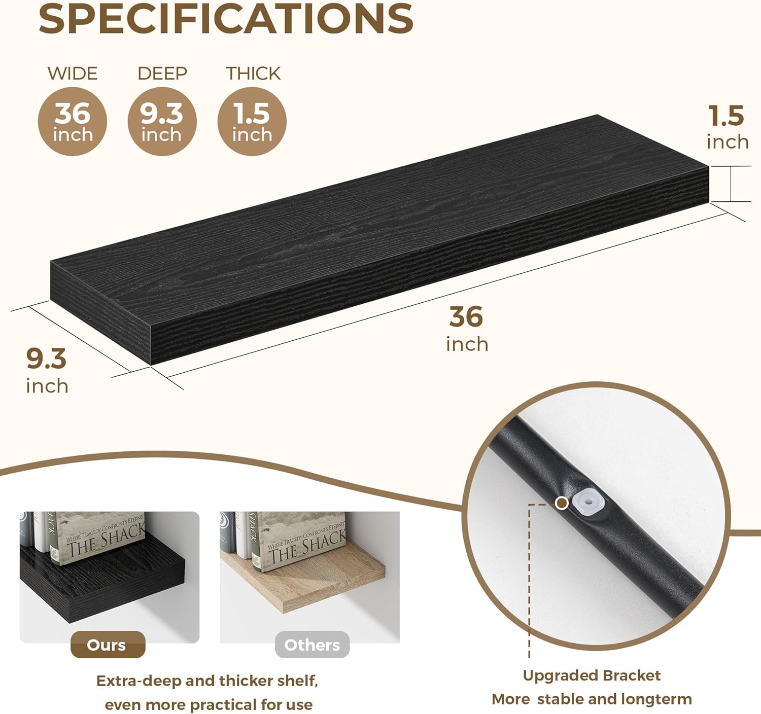 36 Inches Floating Shelves for Wall, 9.3" Deep Long Floating Shelves Set of 2, Large Display & Storage Shelf, Wall Shelf for Bathroom Bedroom Living Room Kitchen Office, Black