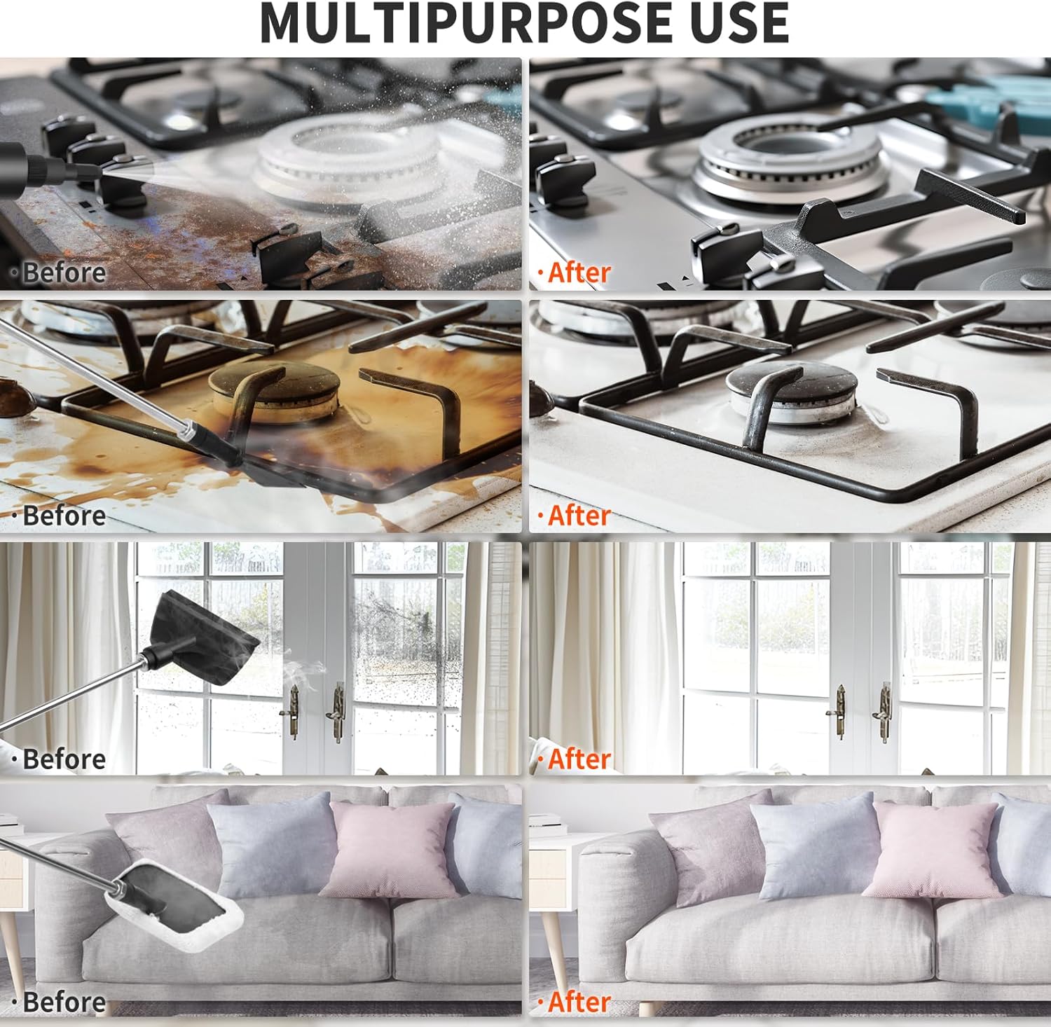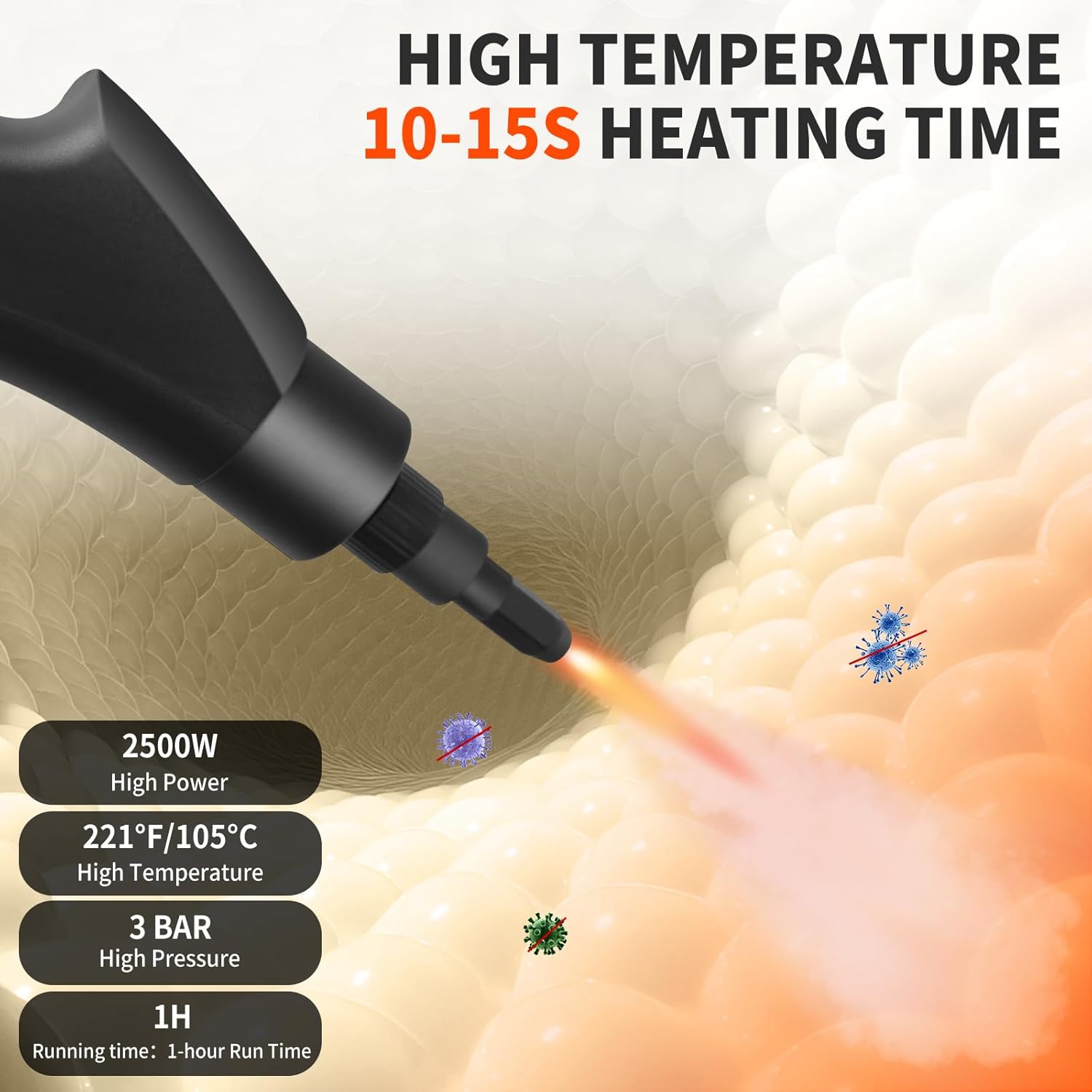 - 【𝐇𝐢𝐠𝐡 𝐏𝐫𝐞𝐬𝐬𝐮𝐫𝐞 𝐒𝐭𝐞𝐚𝐦 𝐂𝐥𝐞𝐚𝐧𝐞𝐫】: The high pressure steam cleaner with 2,500 watts of power that produces 221°F high temperature in just 10—15 seconds, and release 3Bar high pressure, effectively cleaning stubborn greasy dirt and stains. 100% chemical-free, no harmful fumes , the steam cleaner ensures the health of your family and pets.