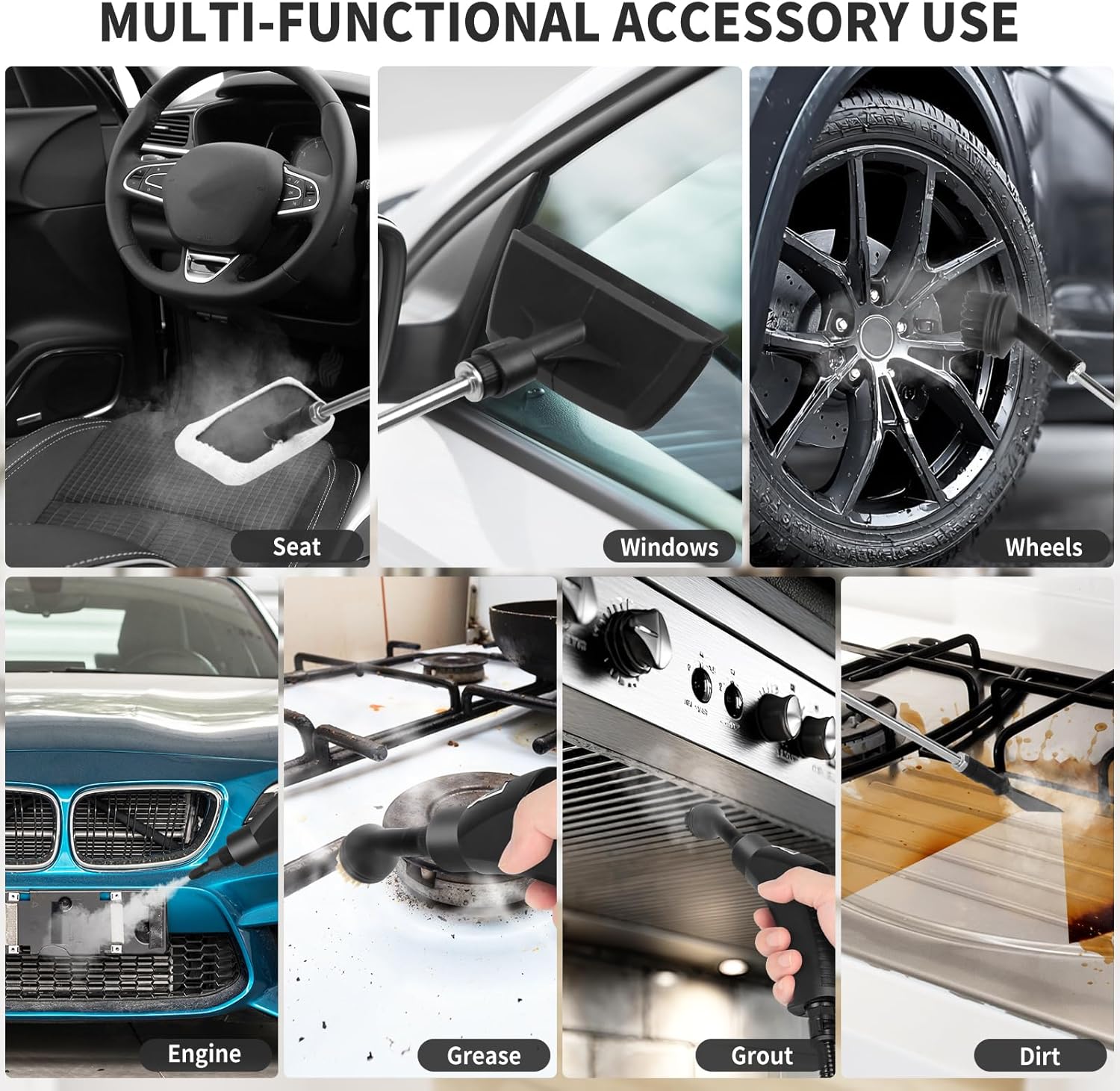 - 【𝐌𝐮𝐥𝐭𝐢-𝐩𝐮𝐫𝐩𝐨𝐬𝐞 & 𝐌𝐮𝐥𝐭𝐢-𝐚𝐜𝐜𝐞𝐬𝐬𝐨𝐫𝐲】: The steam cleaner for home comes with 17 accessories including 2*Small nylon brush, 2*Brass brushes, 2*Big nylon brush, 1*High pressure nozzle, 1*Glass scraper,2*Towel sleeve, 1*Extension pole, 2*rubber rings, 2*Trowels, 1*Gloves, and 1*Towel, the steam cleaner can use different brushes according to cleaning required. Also, the handheld steam cleaner features a steam pipe, power cord and extension tube. Very suitable for cleaning kitchens, cars, tiles, car interiors, and furniture.