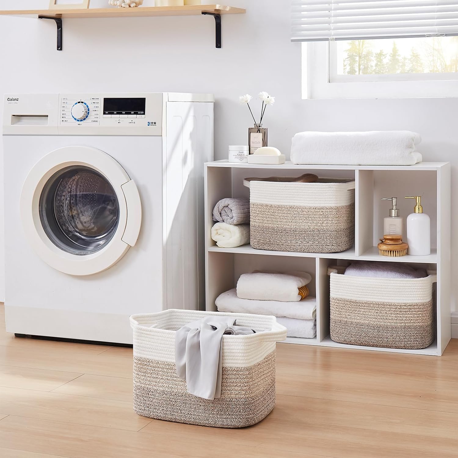- High Quality Cotton Rope Woven: Woven cotton thread is very soft and don't damage your floors and furniture. Seamless design, not easy to tear,More firm than rattan and plastic materials. Our storage basket has no harsh chemiacls added, and the cotton rope basket is safe for kids, elders and pets. Firm enough and stylish enough to go anywhere in the home