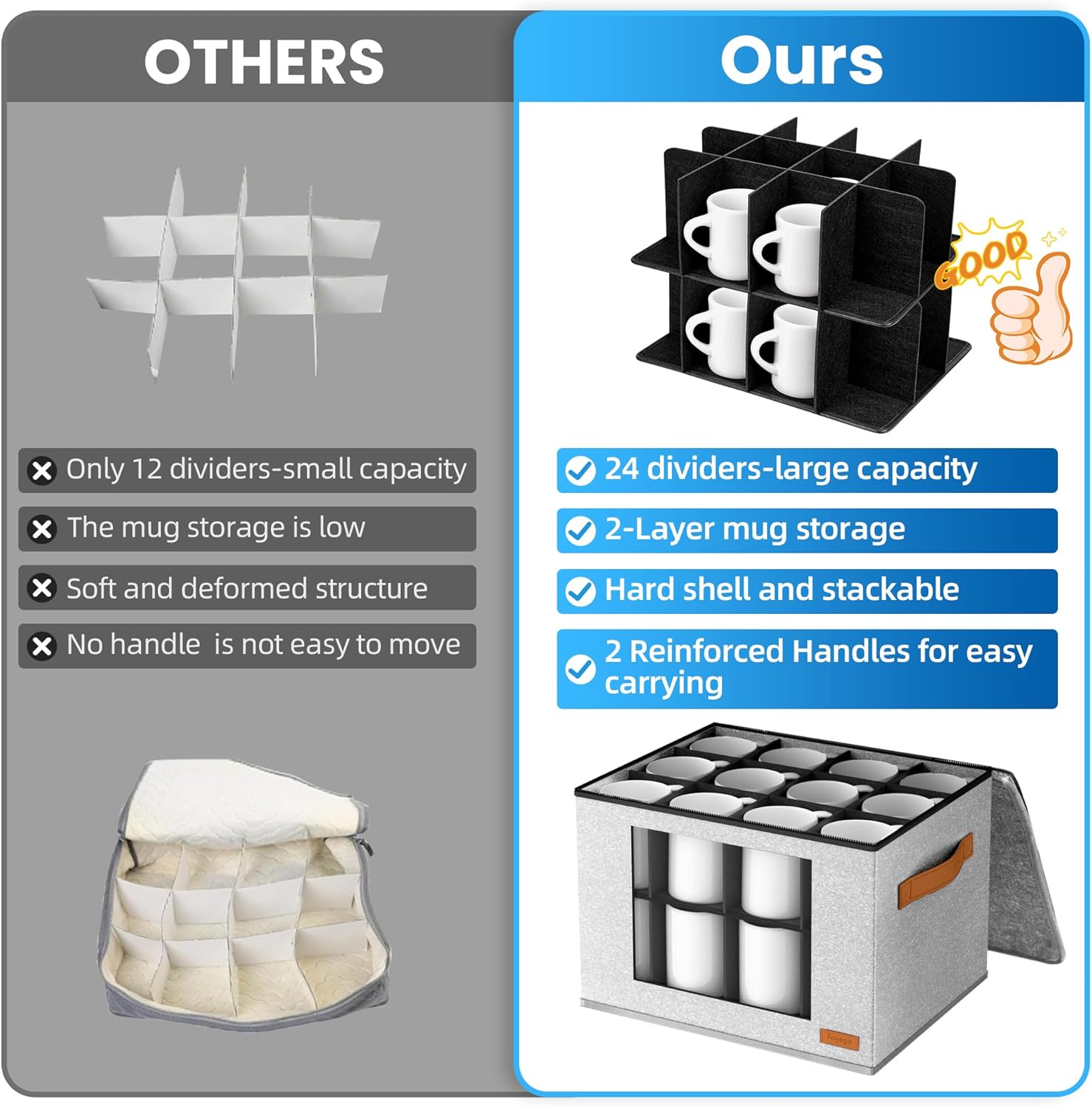 - [Premium Material & Stackable ]This mug storage box with dividers is made of beautiful and upgraded felt, which is more wear-resistant and sturdy. The rigid lid and strong interior make the mug storage organizer stackable, enabling it to save space when storing tableware in the kitchen. while also protecting your mugs, cups, ceramic cups, and glasses from dust.