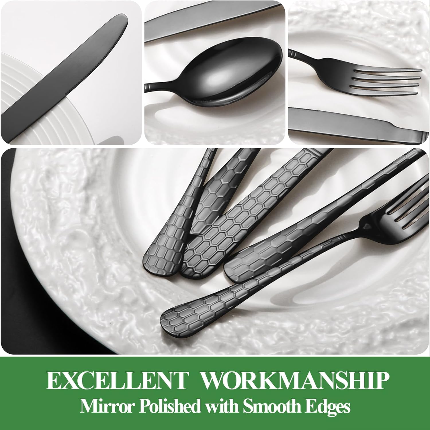 - WONDERFUL WORKMANSHIP AND FUNCTIONAL---Our black utensils set is made of multiple mirror polishing treatment, silverware set with Water Cube handle design Each piece is beautifully adorned with a delicate Water Cube pattern,edge smooth , elegant and classical appearance, adding to the beautiful experience of everyday dining.