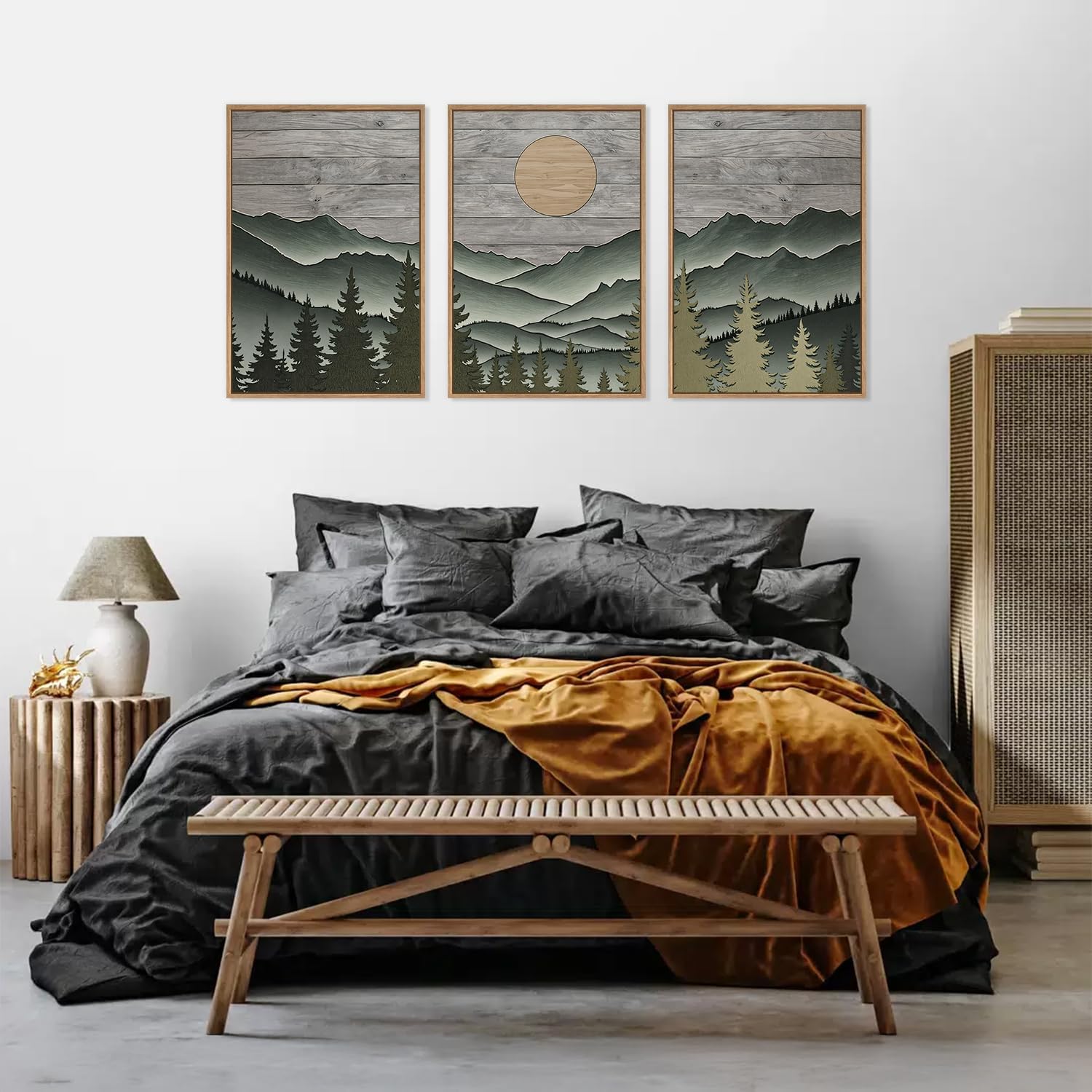 HLNIUC Mountain Framed Canvas Wall Art,Large Green Forest Woodcut Wall Decor Set of 3(16”x24”)Abstract Sun Forest Pine Trees Wall Painting,Rustic Sun Nature Landscape Art Print for Living Room,Bedroom