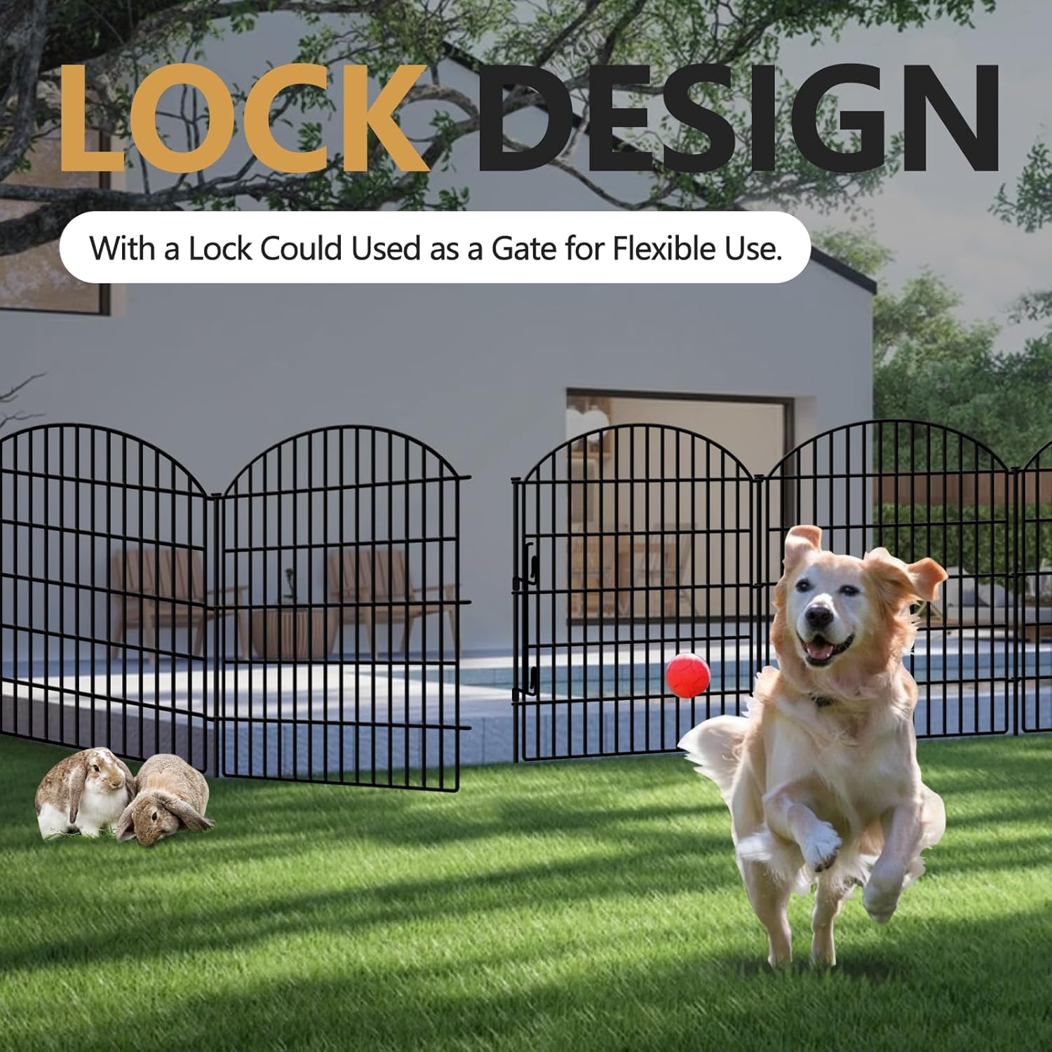 - MORE AVAILABLE SIZE: The classic arch shape design garden fence single piece measures 26.77" wide, 33" high, 1.5" gap. Comes with 19 metal stakes are 44" in height, which can be inserted into about 12.6 inches above the ground, making it strong enough to prevent animals from entering & leaving, dog digging, and even keep rabbits away from your plants. A total of 18 fence panels with a lock , connecting 19 fence stakes, the total length of the garden fence is approximately 40.16 ft.