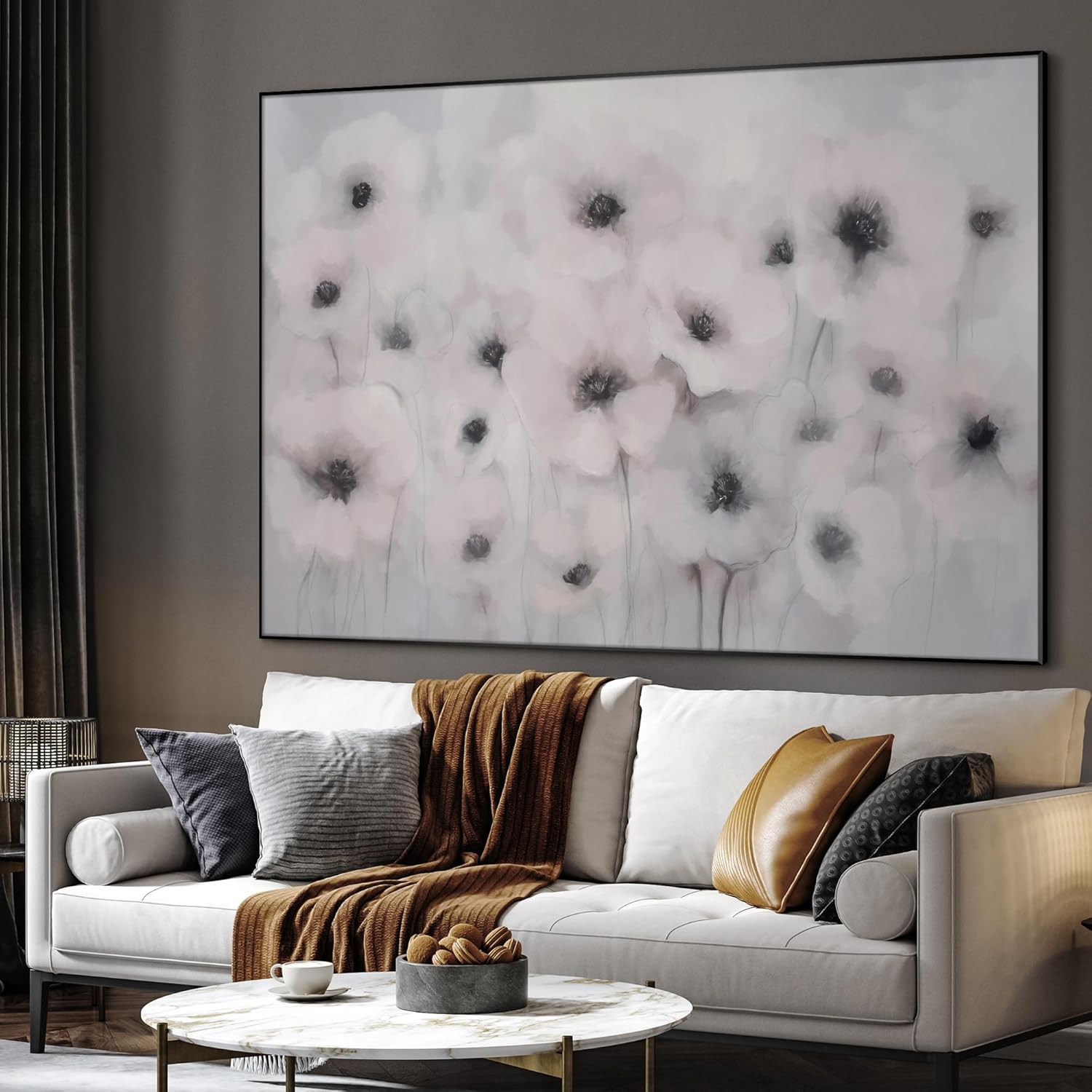 46"x60" Extra Large Framed Wall Art Soft White Poppies Watercolor Floral, Delicate Botanical for Home Living Room Bedroom Decor (Frame Assembly Required)