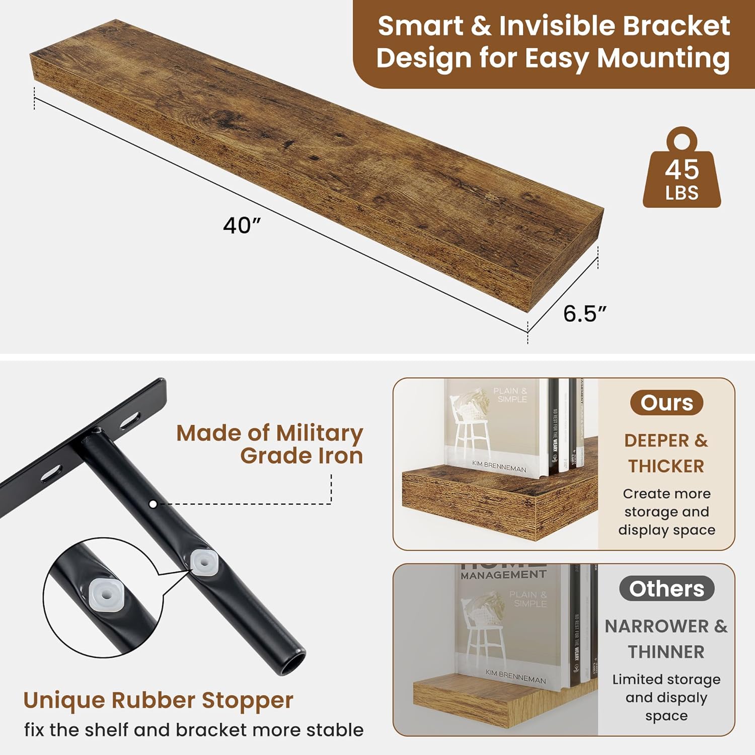 fuqing Floating Shelves for Wall, Bathroom Shelf Wall Mounted for Storage, Shelves with Invisible Bracket for Bedroom, Kitchen, Living Room, Farmhouse Small Book Shelf, 40 Inch Set of 2, Rustic Brown