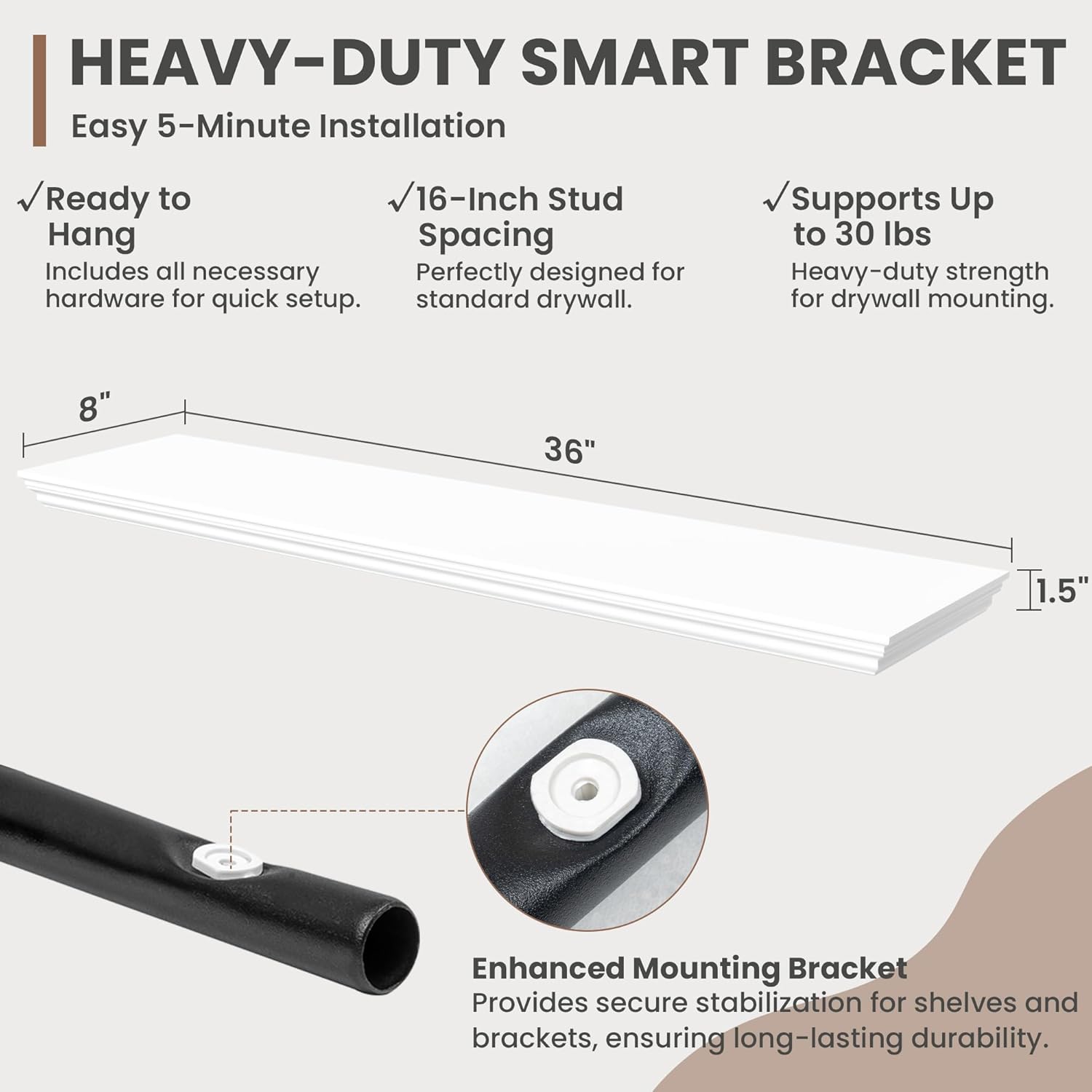 - Package Contents: 1 white floating shelf included, board dimension: 35.5" W x 7.9" D x 1.5" H. Other accessories: 1 metal brackets, 1 magnetic level, 3 wood iron connection screws, 8 wall screws and expansion tubes, and 1 installation manual