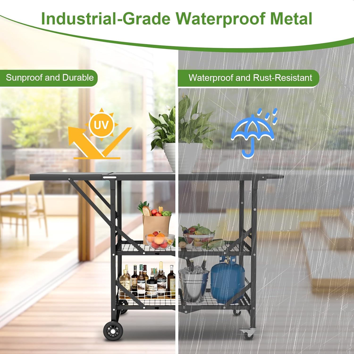 - 2-Step Installation: Simply attach the wheels and unfold it. You'll be able to use the grill cart in under 1 minute. And when you're done, it folds up in less than 5 seconds to fit into a compact space.