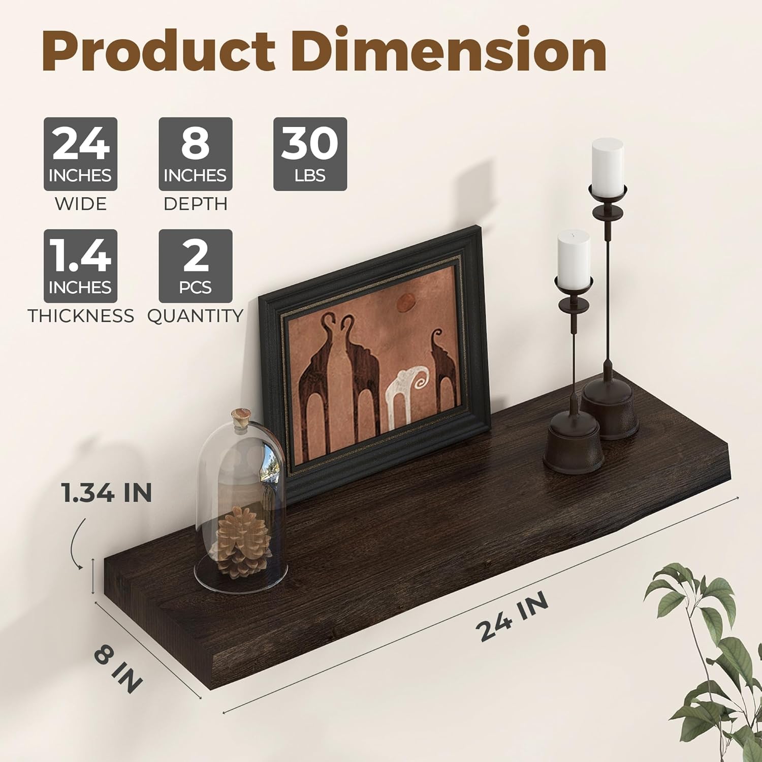 Axeman 24 inch Floating Shelves for Wall - 8'' D Live Edge Rustic Solid Elm Wood Floating Shelves Wall Mounted, Wall Shelves with Invisible Bracket for Living Room Bedroom Kitchen, Set of 2 Walnut
