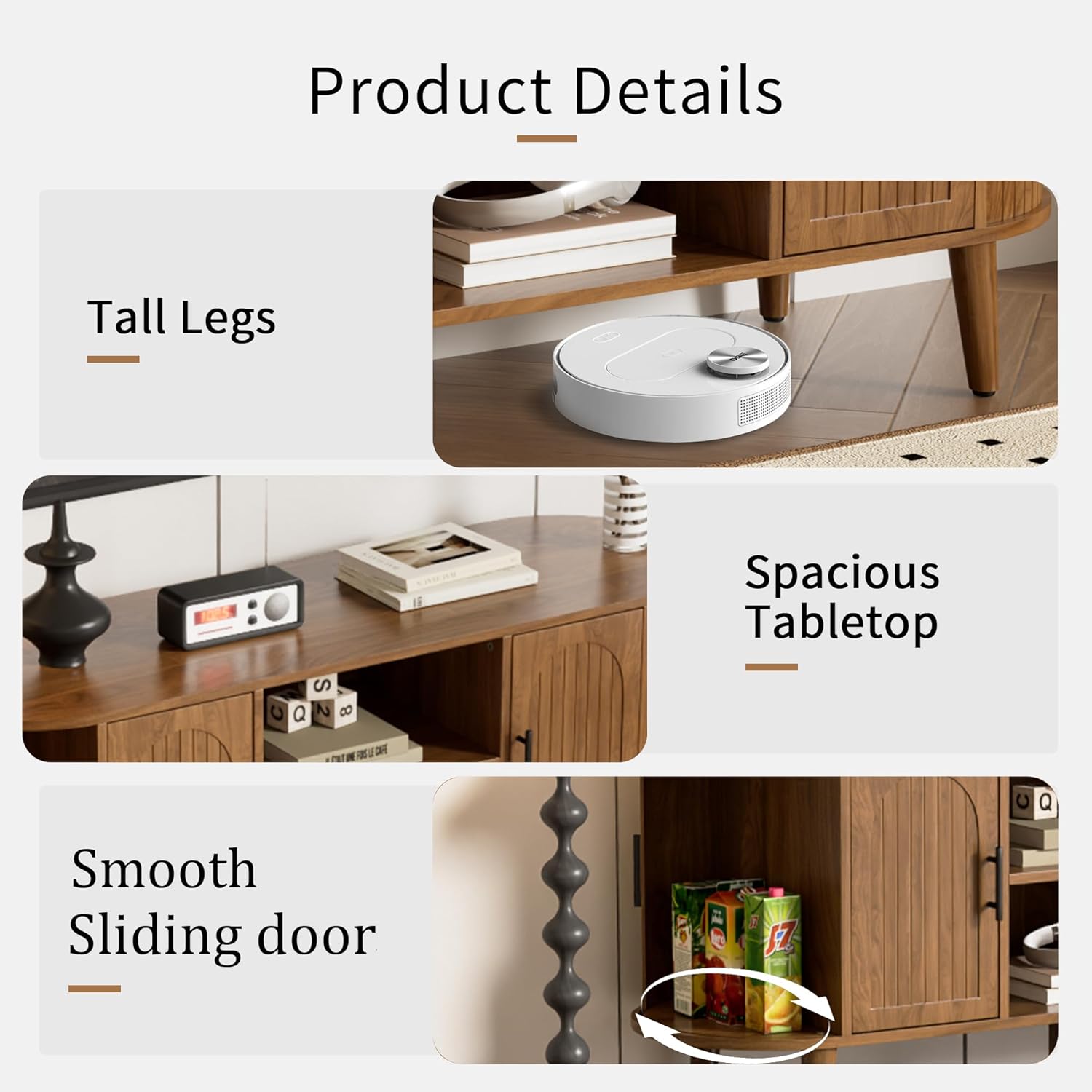 - Elegant TV stand: This mid-century modern style TV stand features curved sliding doors and arched doors, decorated with grooved vertical stripes and metal black handles. The unique design style adds a touch of elegance to the living room or bedroom. It is easy to operate, and the curved design is safer, reducing the risk of accidental collisions, making it an ideal furniture choice for improving the happiness index of the home