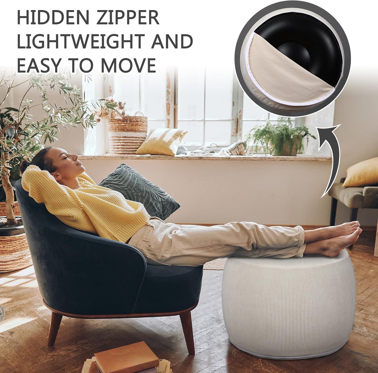 - Easy and Convenient Design: experience the simplicity of convenience with the inflatable PVC core of our modern ottoman; It's designed to preserve its shape while offering excellent foot support, whether you're seated or resting; The cover features a hidden zipper, is machine washable, and the lightweight design allows for easy portability