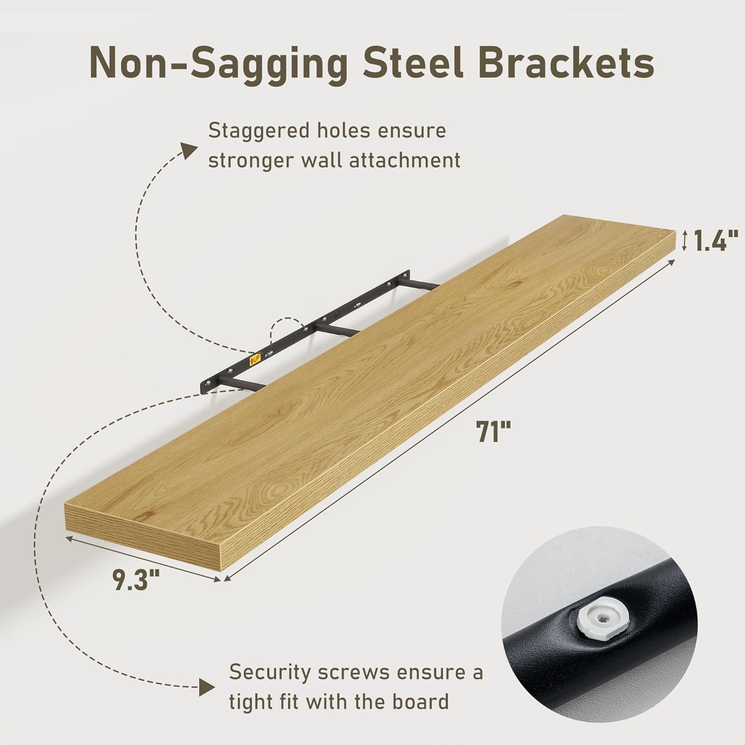 - 72 Inch Floating Shelves for Wall (Set of 2): Each wall shelves are 9.3 inches in depth and 1.4 inches in thickness. 2-piece set is more cost-effective and practical. Our wall shelf can be used in combination, staggered high or low on the wall, or mounted side-by-side to provide extra storage space for organizing small items and clutter in multiple areas such as kitchens, bathrooms, and bedrooms, creating a clean and smooth look. Multiple colors available
