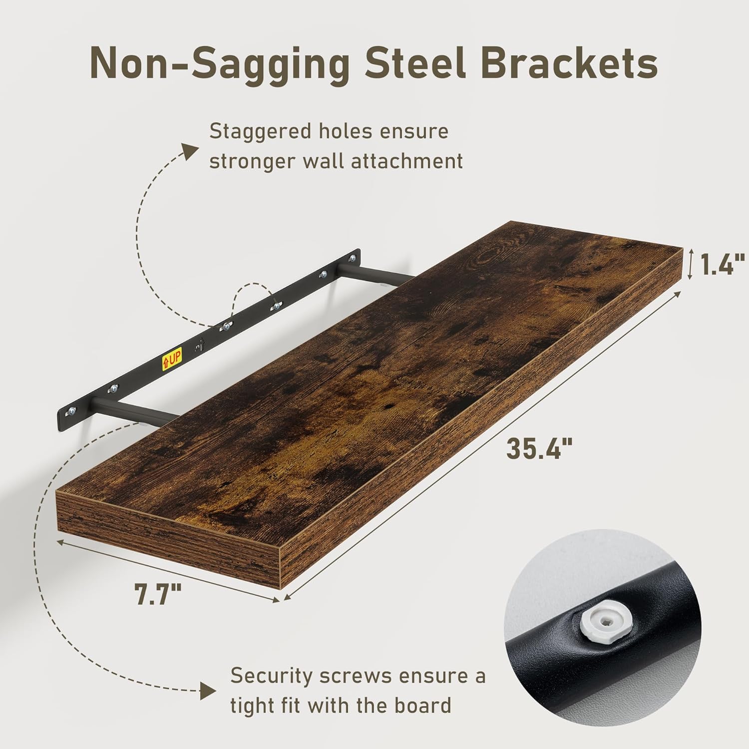 - Easy To Assemble: This floating shelves not only come with stainless-steel galvanized invisible brackets, but also equipped a fixing screw at the bottom to fix the shelf on the support rod, which solves the problem of sliding and is not easy to damage, and can be used for a long time. Instructions, magnetic level, drywall anchors, and screws included. This is great because you can easily mount these rustic shelves Gap-Free to any surface in less than 10 minutes