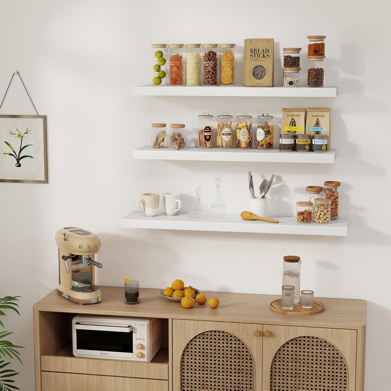 - 36 Inch Floating Shelves for Wall (Set of 2): Each wall shelves are 8 inches in depth and 1.4 inches in thickness. 2-piece set is more cost-effective and practical. Our wall shelf can be used in combination, staggered high or low on the wall, or mounted side-by-side to provide extra storage space for organizing small items and clutter in multiple areas such as kitchens, bathrooms, and bedrooms, creating a clean and smooth look. Multiple colors available