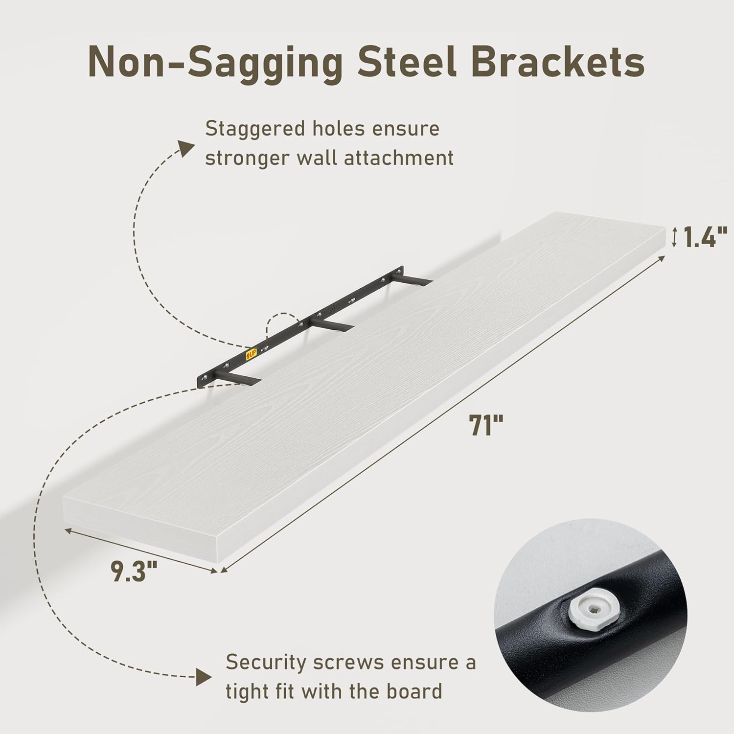 - 72 Inch Floating Shelves for Wall (Set of 2): Each wall shelves are 9.3 inches in depth and 1.4 inches in thickness. 2-piece set is more cost-effective and practical. Our wall shelf can be used in combination, staggered high or low on the wall, or mounted side-by-side to provide extra storage space for organizing small items and clutter in multiple areas such as kitchens, bathrooms, and bedrooms, creating a clean and smooth look. Multiple colors available