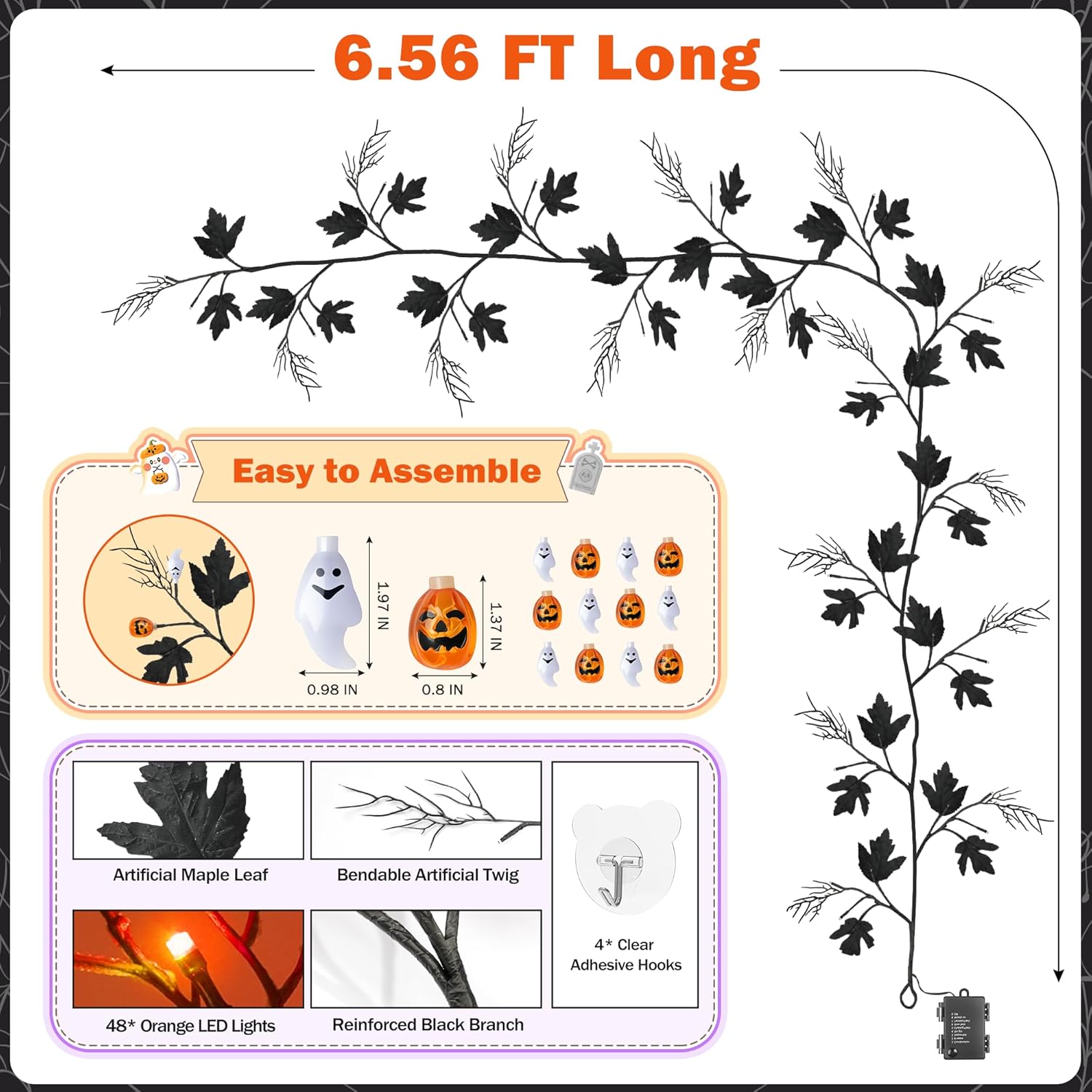 - 8 Changing Modes: Contains 8 lighting modes automatically turns in on timer, warm and bright, gives you the flexibility to adjust the ambiance; 3 AA batteries powered(not included); orange LED lights woven into the vine create an eerie yet cozy atmosphere, brings a festive, spooky touch to Halloween decor