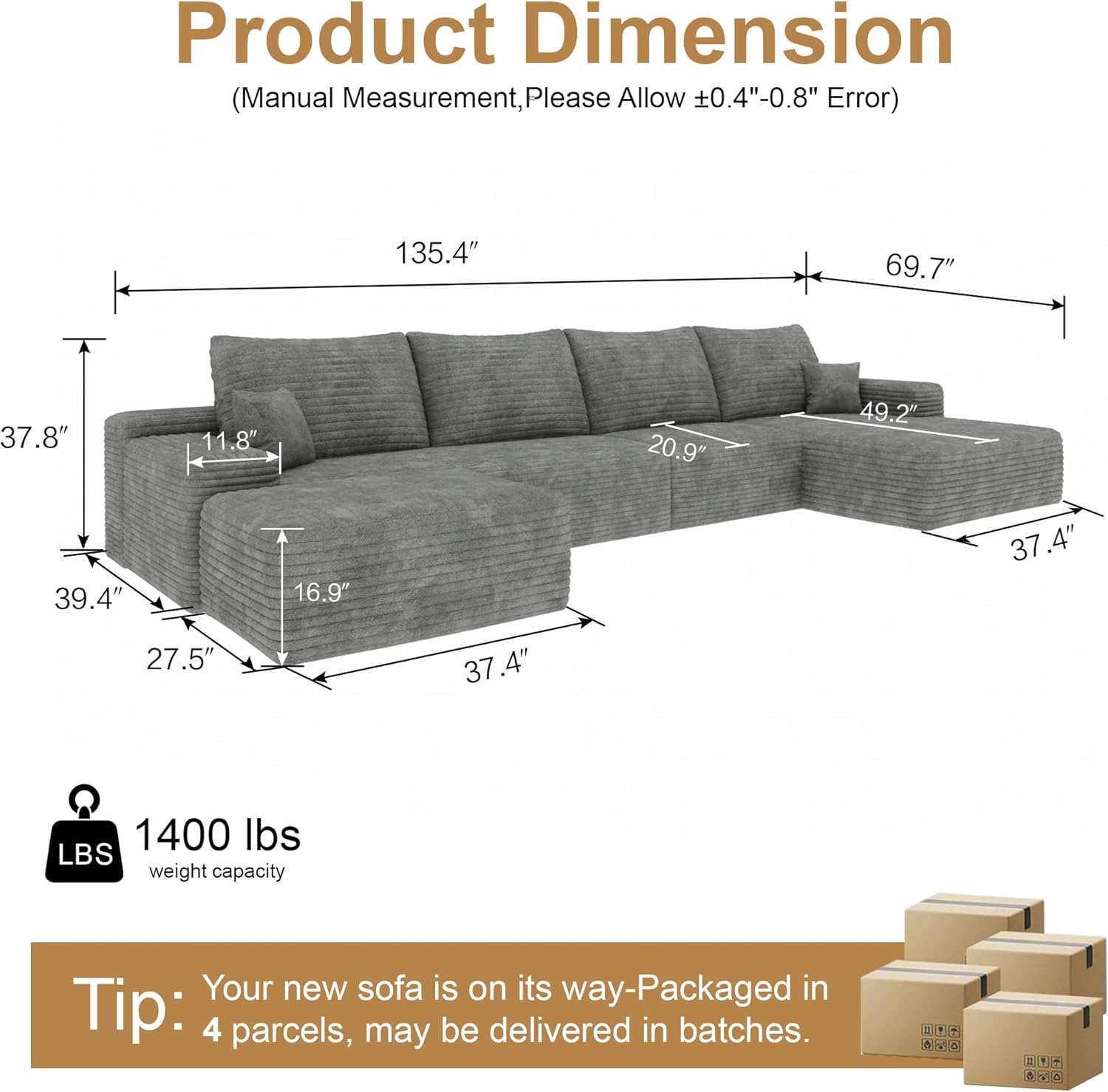 136" Sectional Couches for Living Room Modern Modular Sofa with L-Shape Couchs Upholstered Boneless Couch Deep Seat Sectional Couch with Chaise (Grey, Right Facing Chaise+3Seaters+Ottoman)