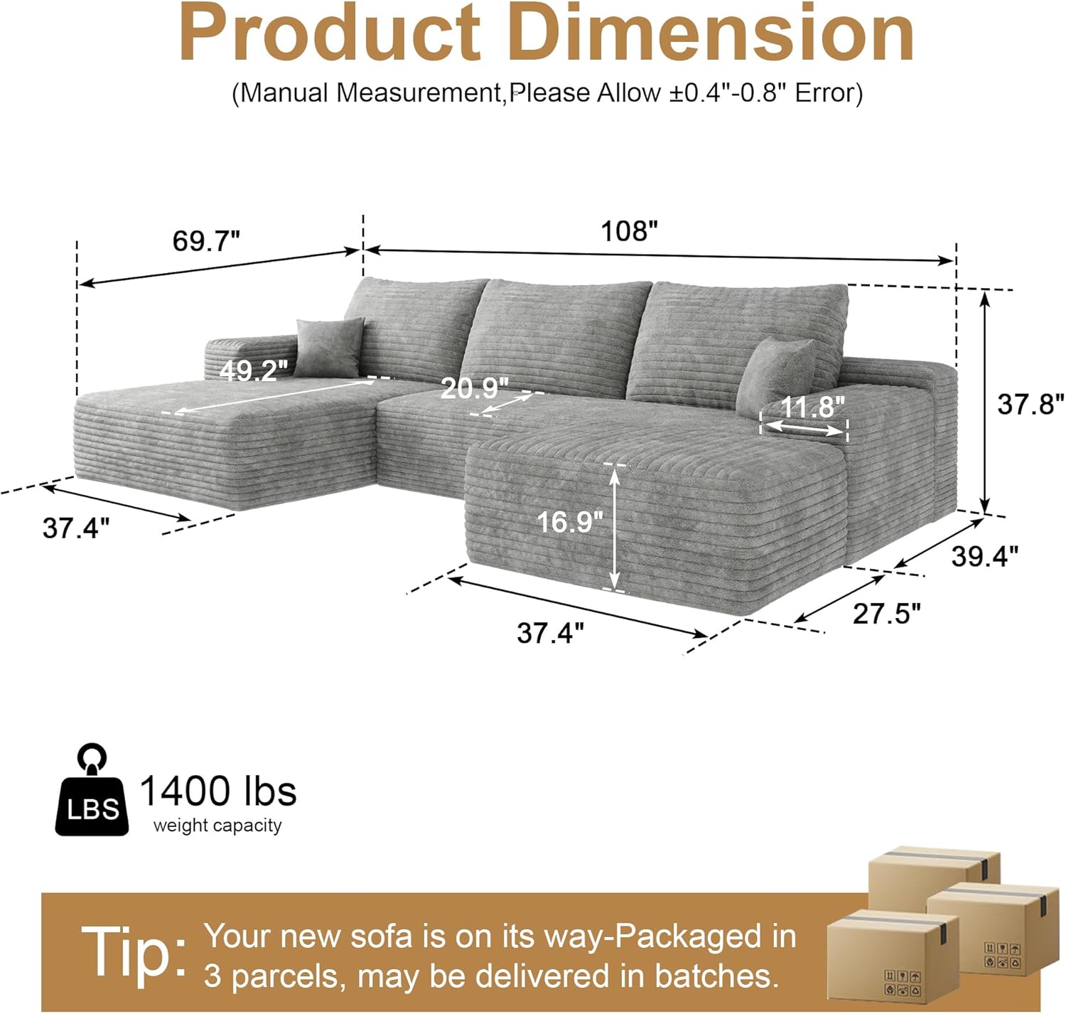 108" Sectional Couches for Living Room Modern Modular Sofa with L-Shape Couchs Upholstered Boneless Couch Deep Seat Sectional Couch with Chaise (Grey, Left Facing Chaise+2Seaters+1Ottoman)