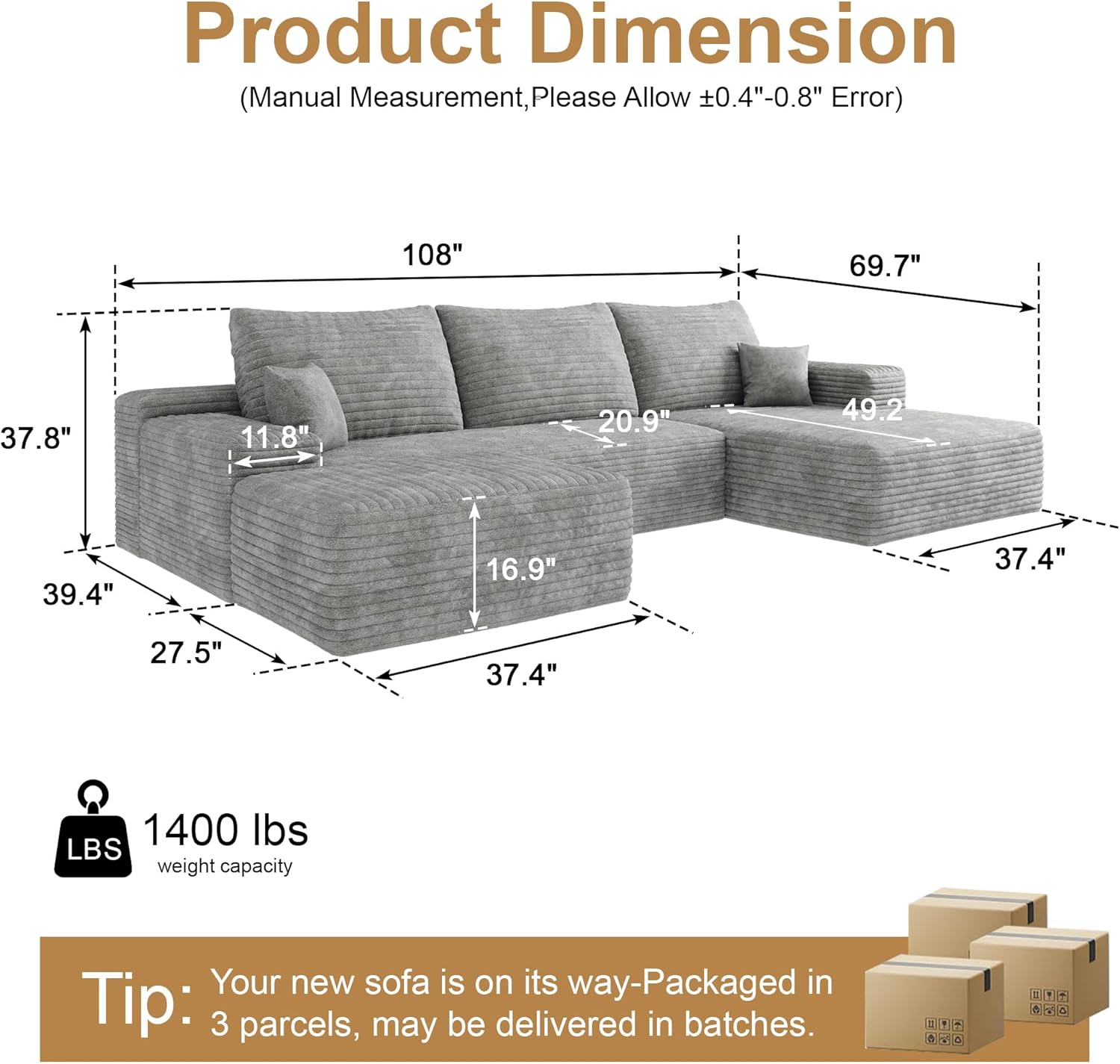 108" Sectional Couches for Living Room Modern Modular Sofa with L-Shape Couchs Upholstered Boneless Couch Deep Seat Sectional Couch with Chaise (Grey, Right Facing Chaise+2Seaters+1Ottoman)