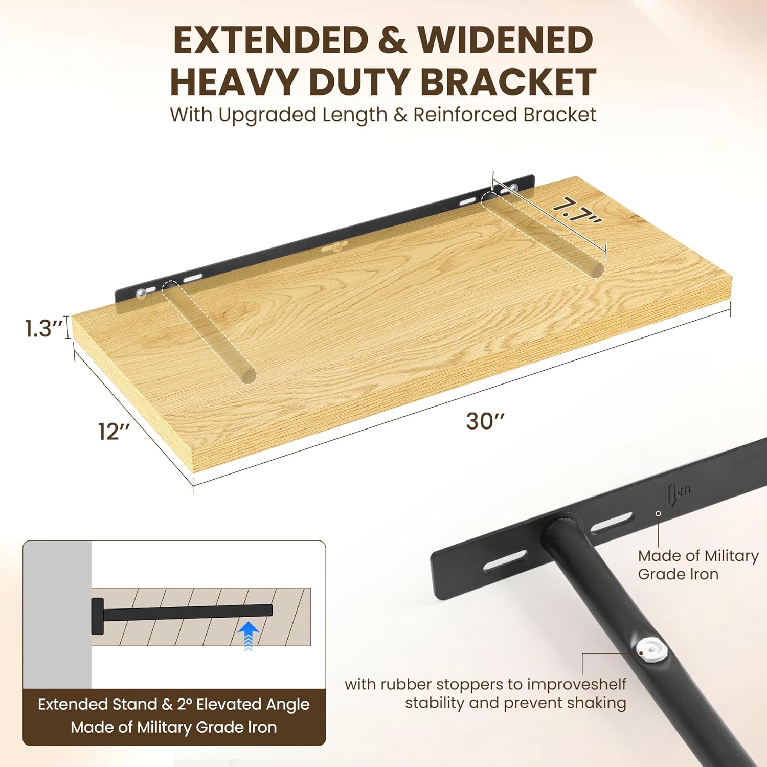 30" Floating Shelves for Wall, 12" Deep Slim Oak Floating Shelves, Wall-Mounted Shelves for Bedroom, Living Room, Kitchen, Bathroom - Set of 2